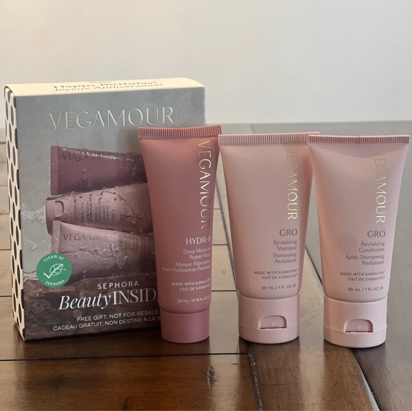 130Three-piece travel-sized set. Includes Hydr-8 Deep Moisture Repair Mask, Gro Revitalizing Shampoo, and Gro Revitalizing Conditioner. Free gift, not for resale.