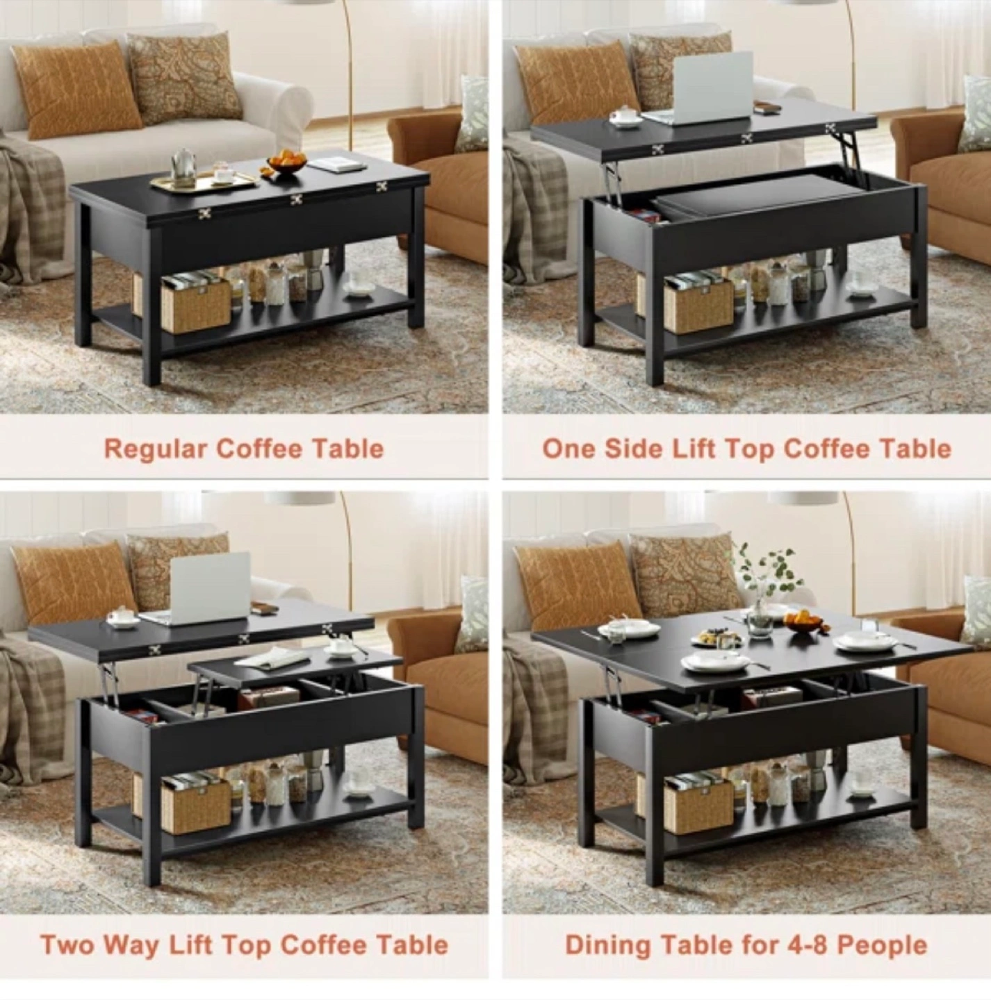 Black versatile lift top coffee table, featuring spacious open shelf and hidden compartments. Converts to dining table. Great for small spaces.