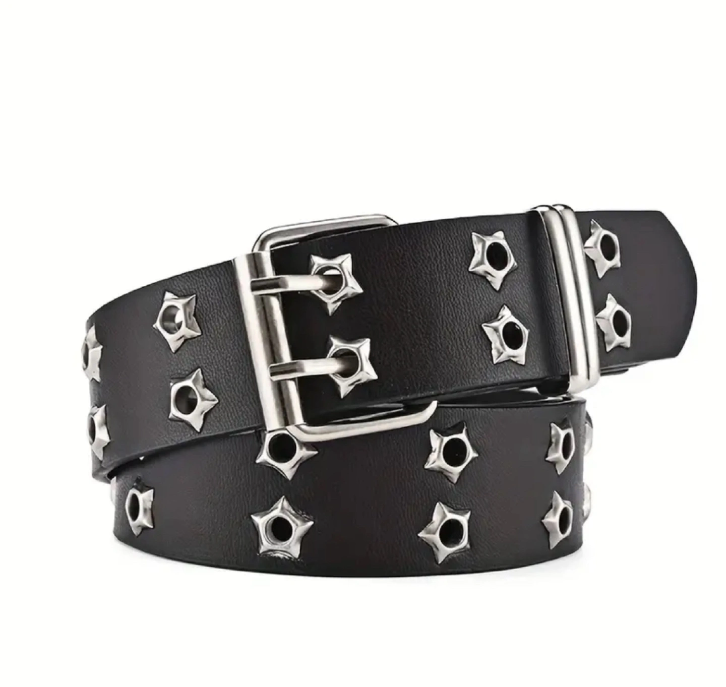 Double-layered black leather belt. Features a silver-toned metal buckle and star-shaped eyelets. Punk rock or goth style.