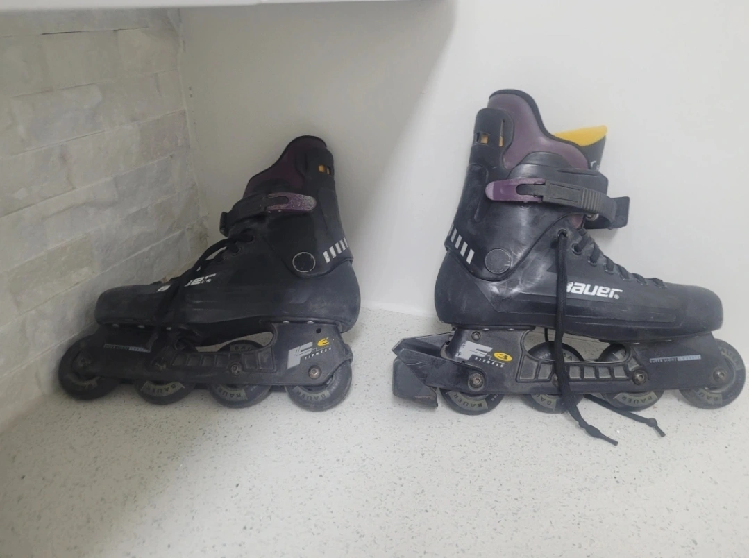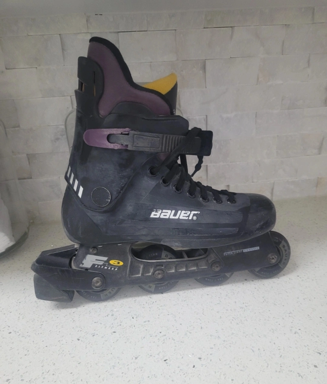 Pair of gently used Bauer Fitness inline skates. Size 8. Made in Canada. Black with purple accents. wheels are in excellent condition