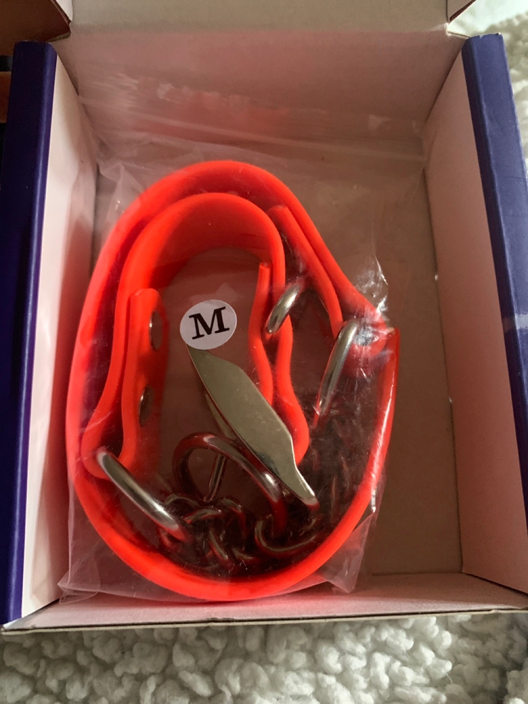 New, never used. Bright orange silicone collar. Includes matching chain. Size medium. Made in the USA.