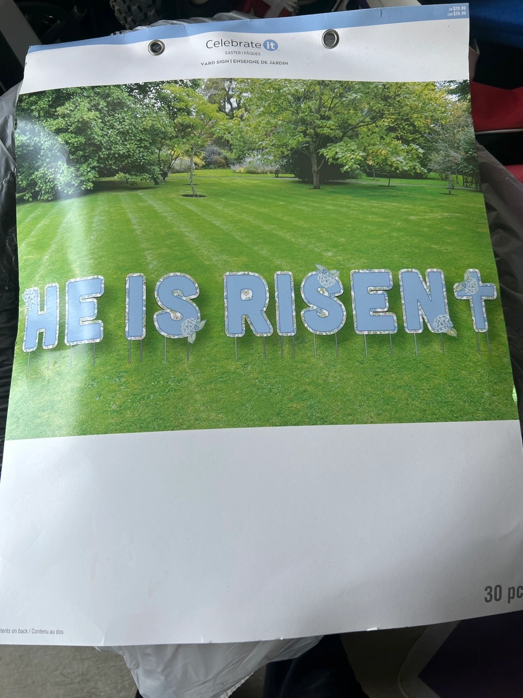 30-piece Easter yard sign. Blue and white hydrangea design. Letters spell out "He is Risen". Includes metal stakes. Perfect for your spring décor.