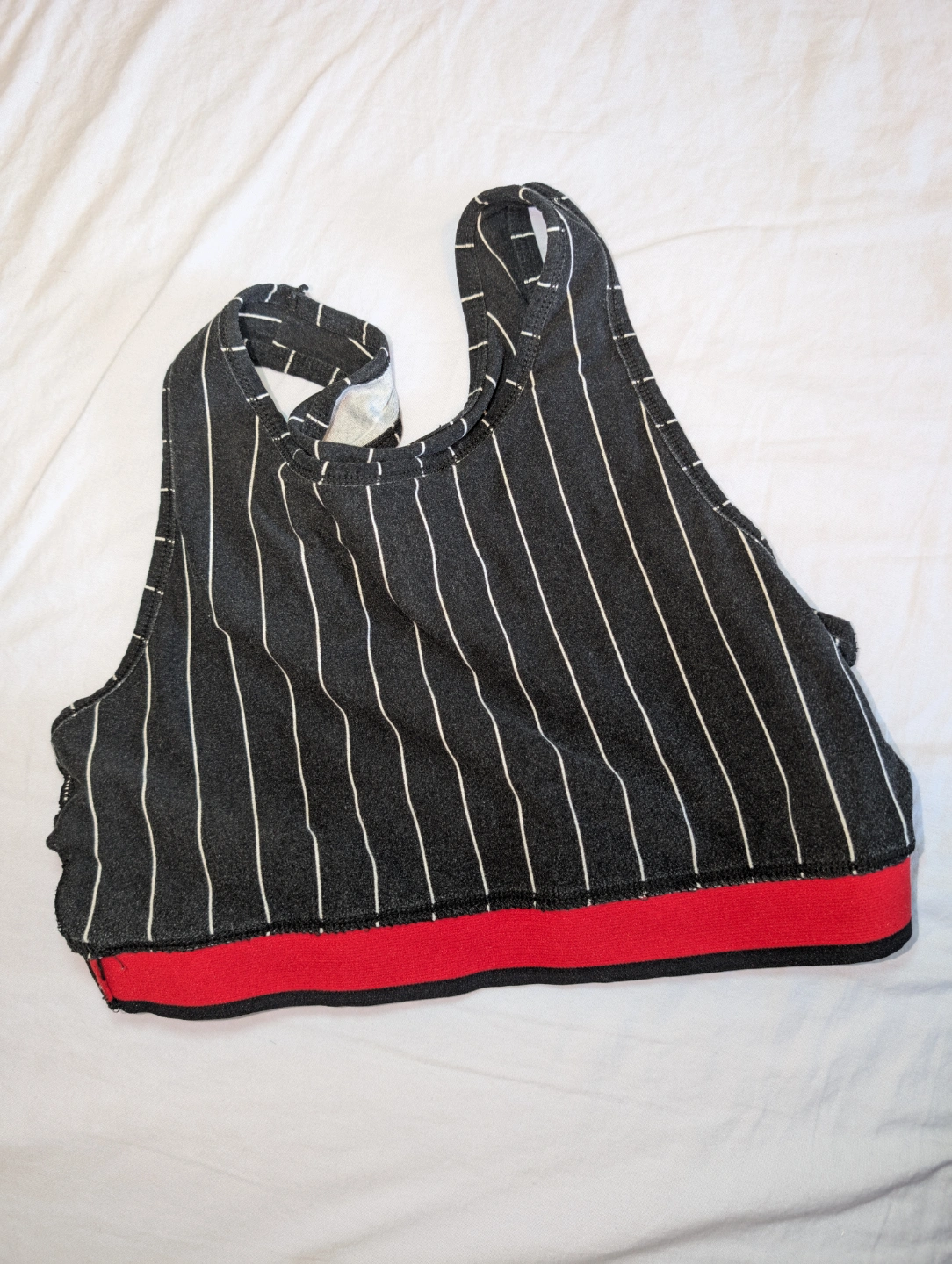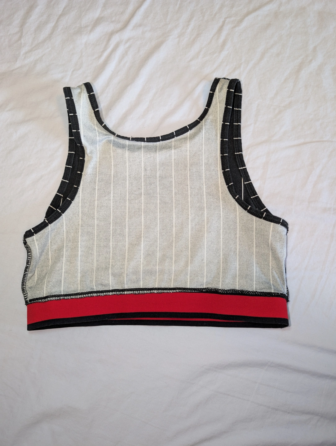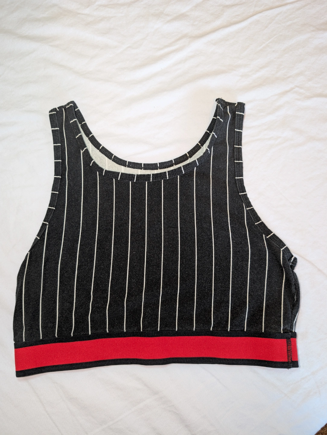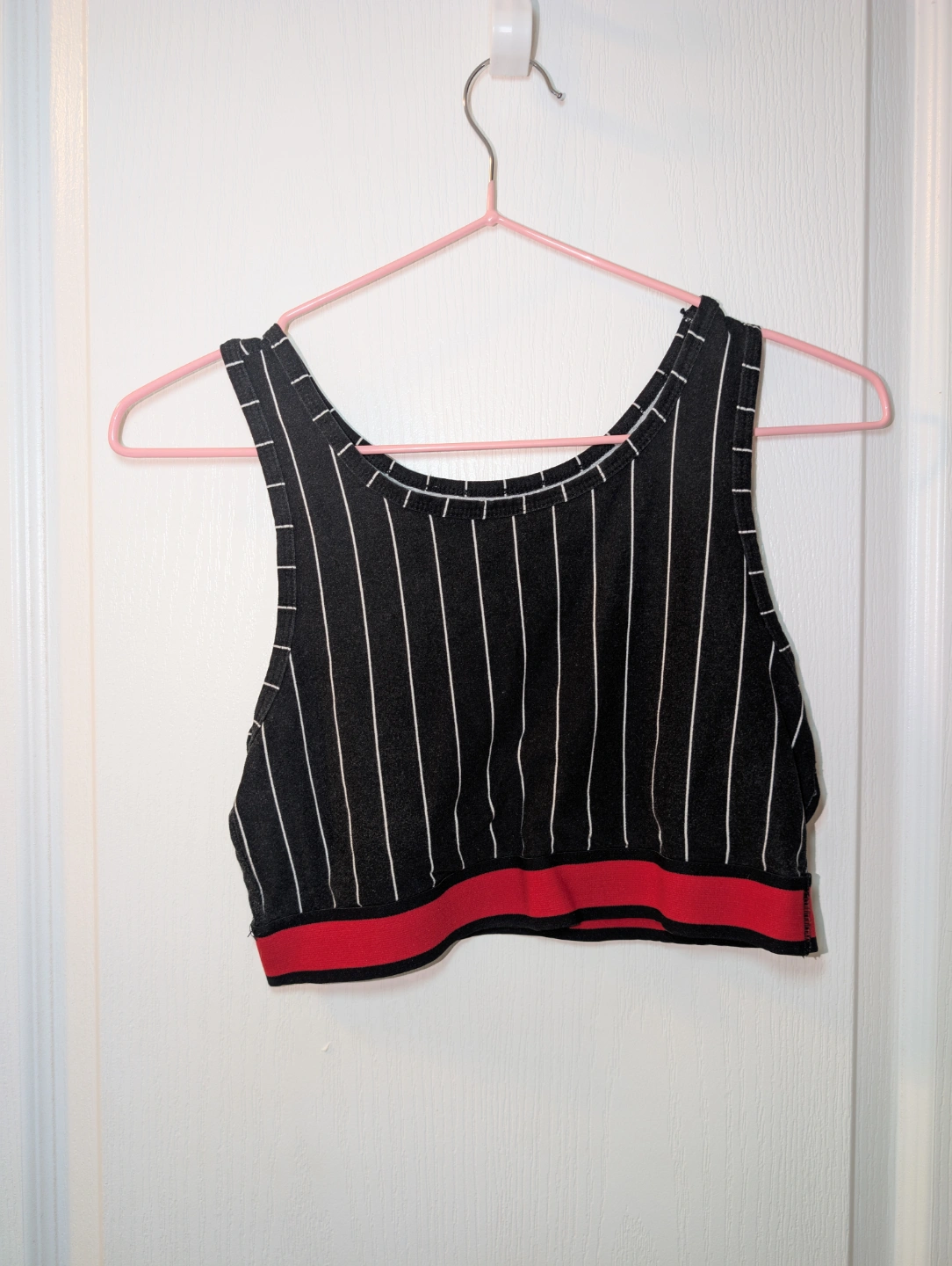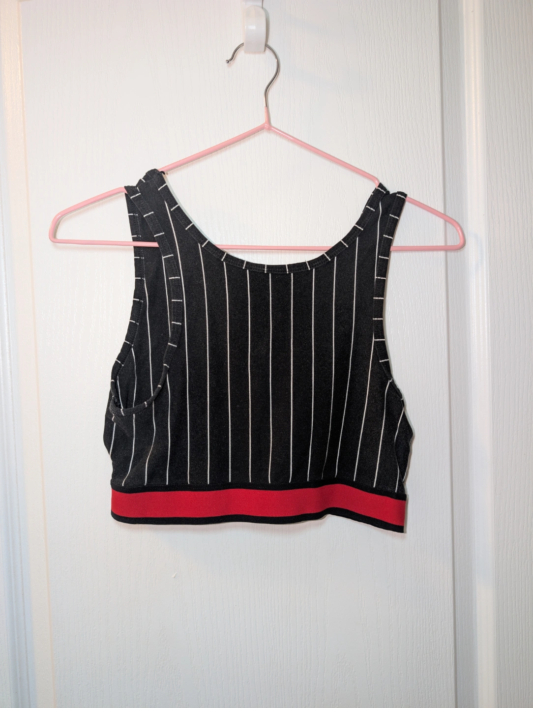 62Women's athletic crop top. Black and white pinstripe pattern. Red band at the bottom. Racerback style.