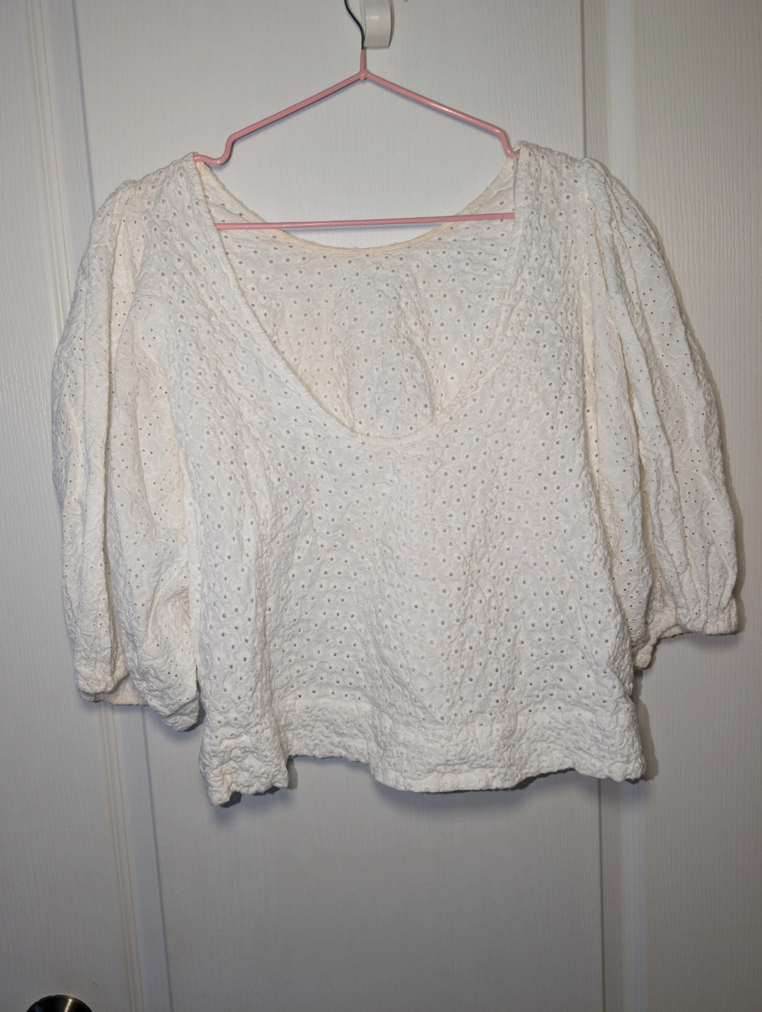 Buy & SellZara White Eyelet Puff Sleeve BlouseZara White Eyelet Puff Sleeve Blouse$25Women's white eyelet blouse. Features puff sleeves and a round neckline. Lightweight fabric. Great for spring and summer.ConditionGoodSizeLWHERE TO MEETRoyalwoodView MapSELLERverifiedSosDakota Crossing651 review0 chats·1 favorites·11 views