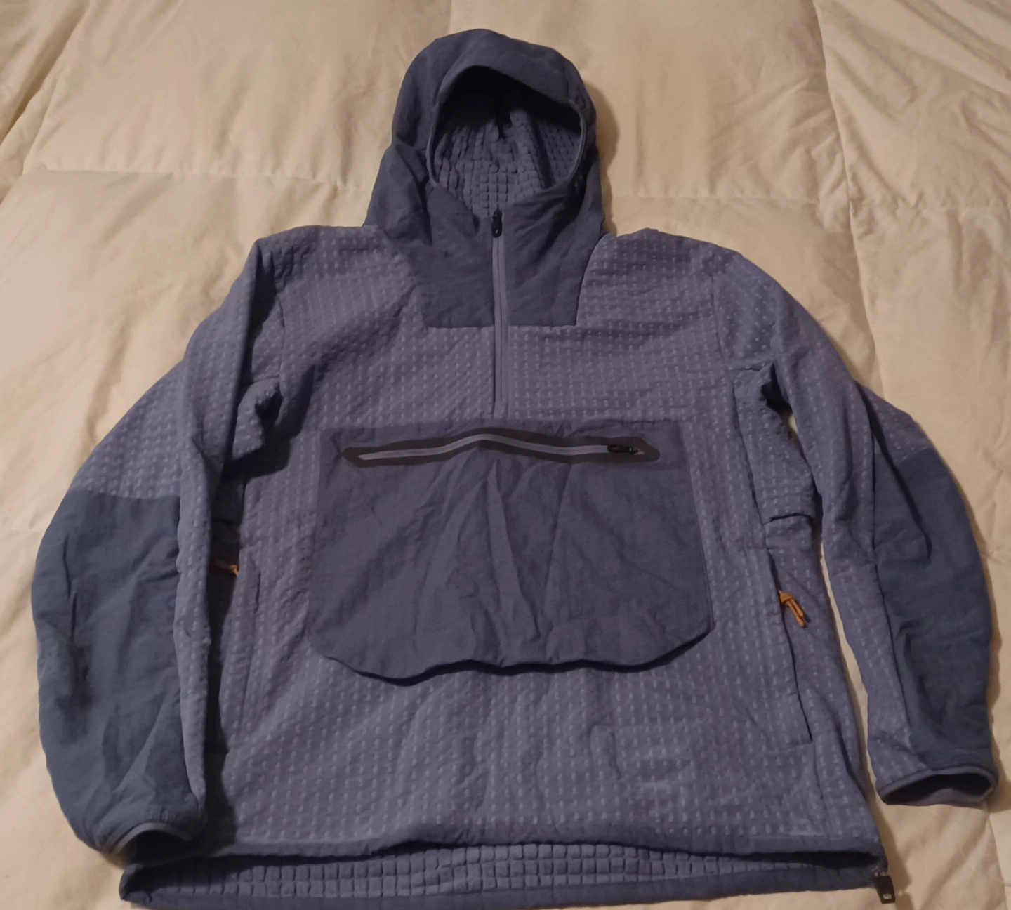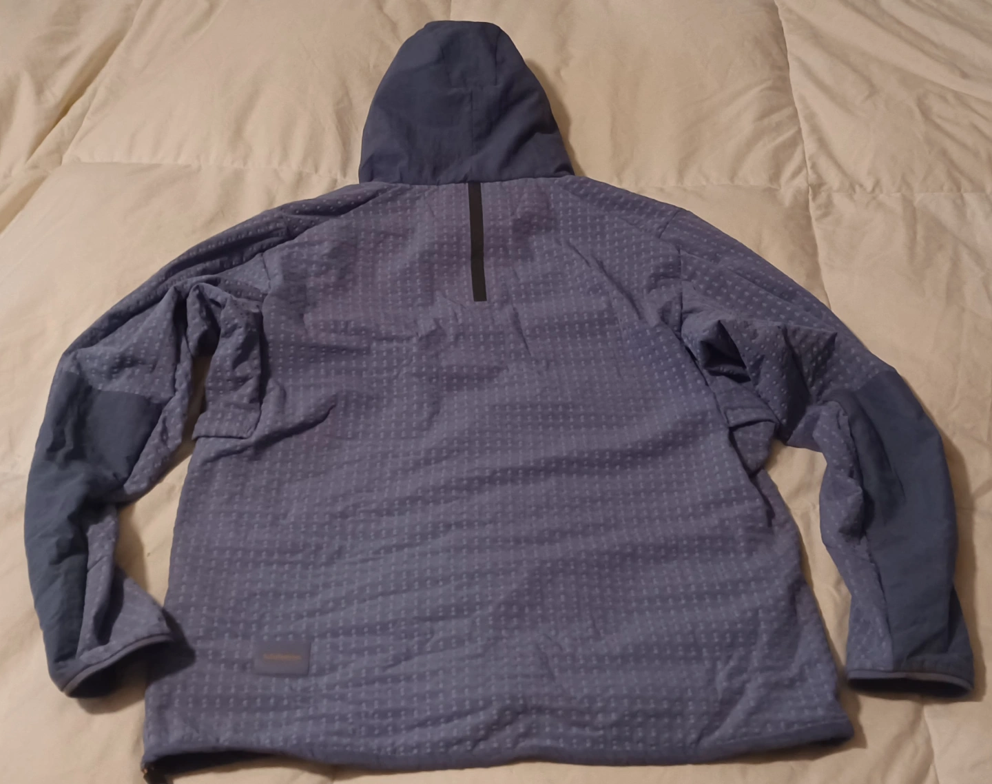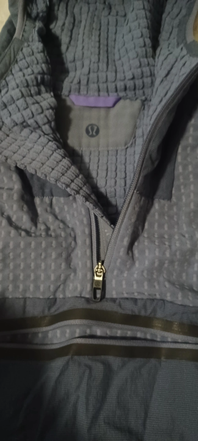 Lululemon half-zip pullover. Features a textured fabric, a hood, and multiple pockets. Great for layering. Waterproof hiking jacket that is easily packed!