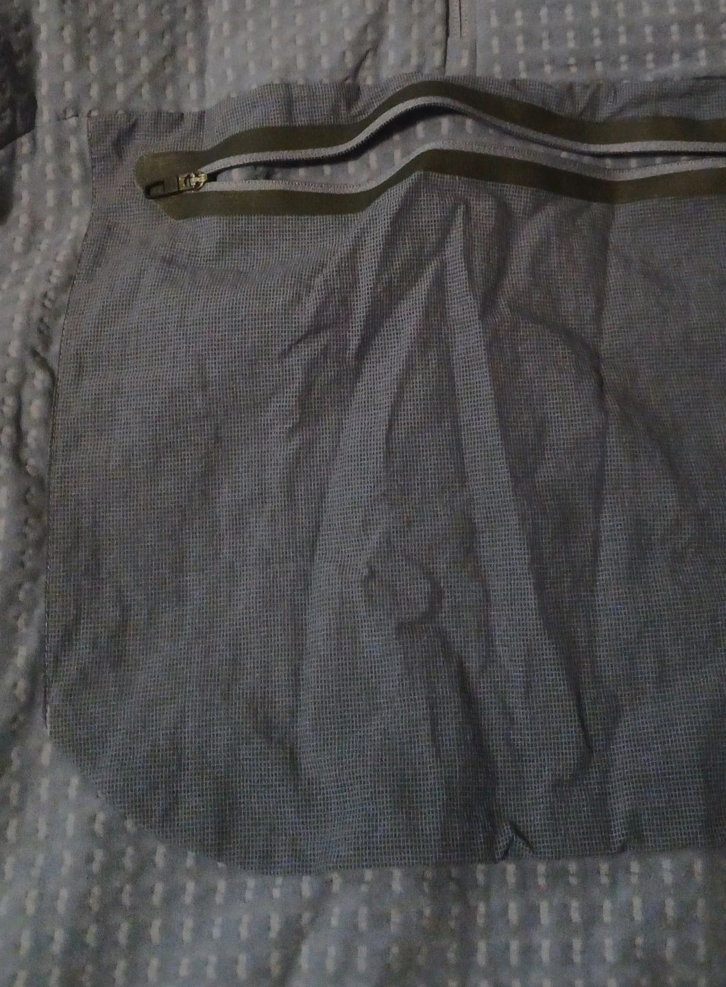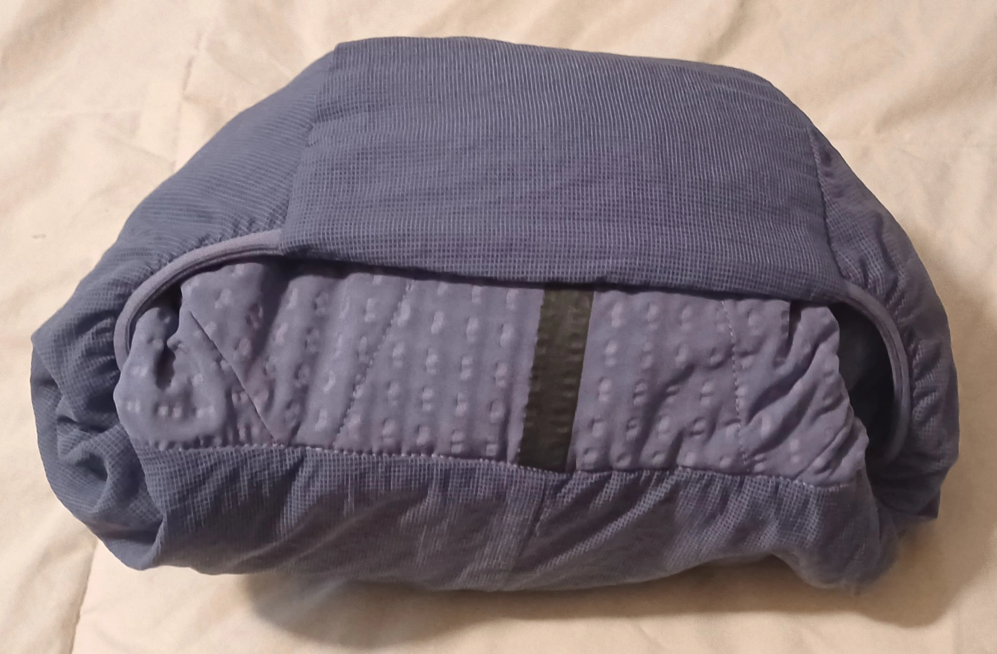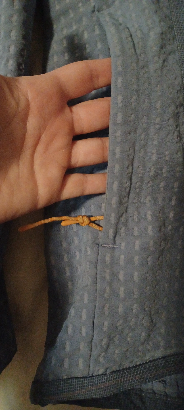 Lululemon half-zip pullover. Features a textured fabric, a hood, and multiple pockets. Great for layering. Waterproof hiking jacket that is easily packed!