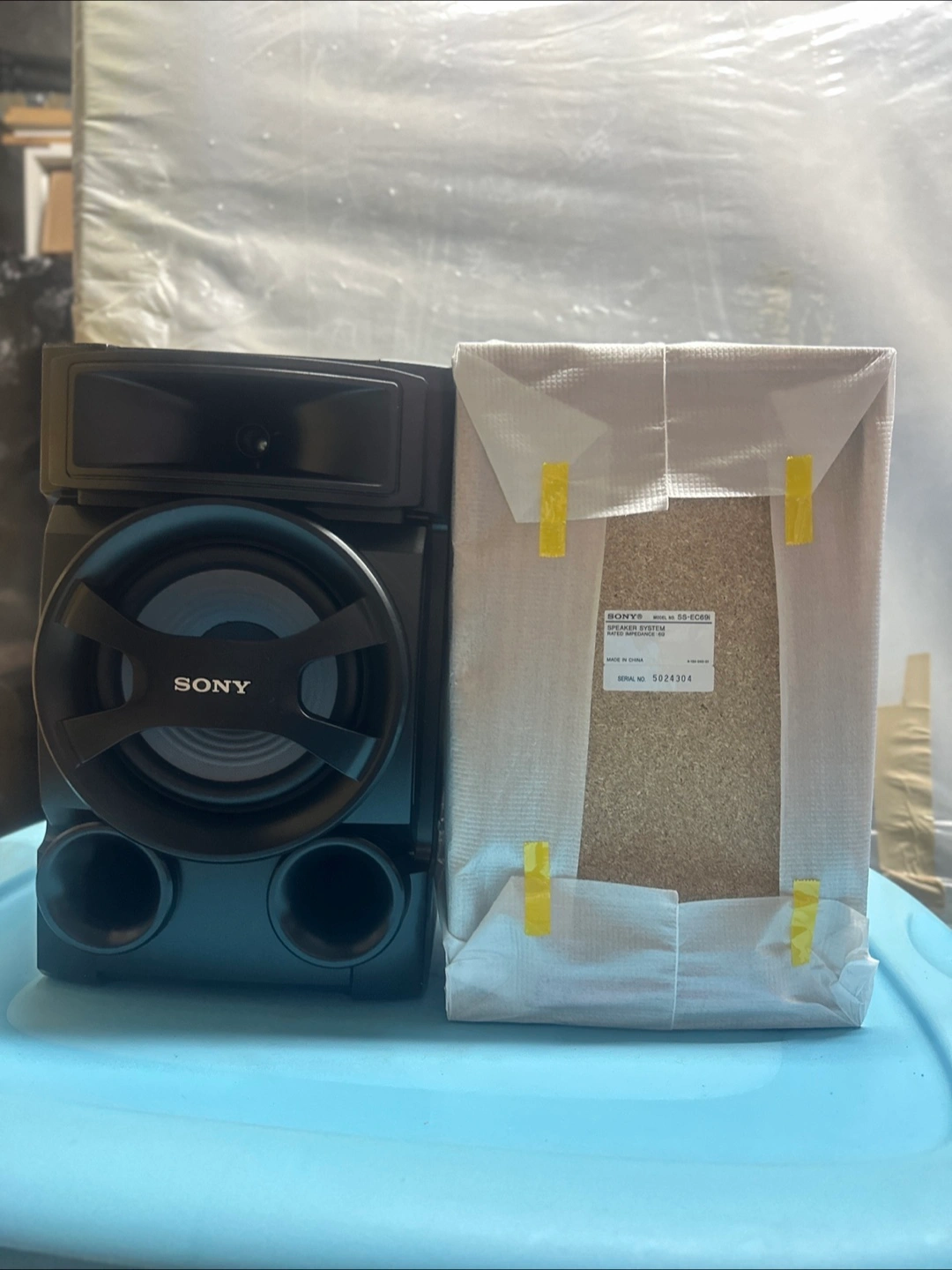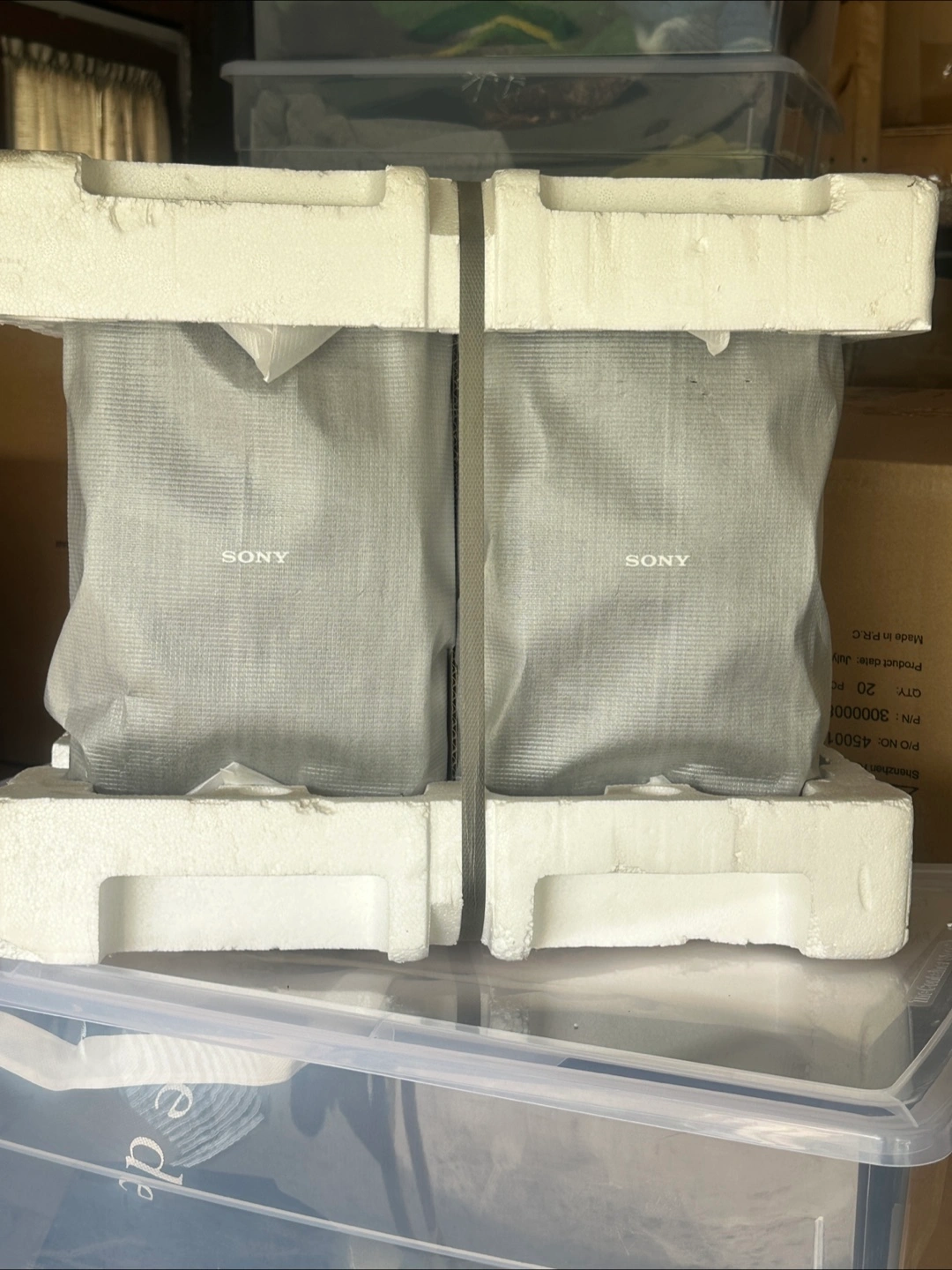 New Sony speakers, still in original packaging. Protected by styrofoam and fabric bags. Excellent condition.