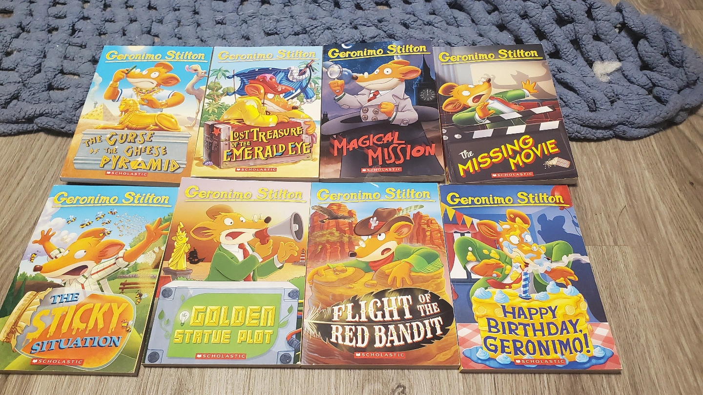 Collection of eight Scholastic Geronimo Stilton books. Titles include: The Curse of the Cheese Pyramid, Lost Treasure of the Emerald Eye, Magical Mission, The Missing Movie, The Sticky Situation, Golden Statue Plot, Flight of the Red Bandit, and Happy Birthday, Geronimo!