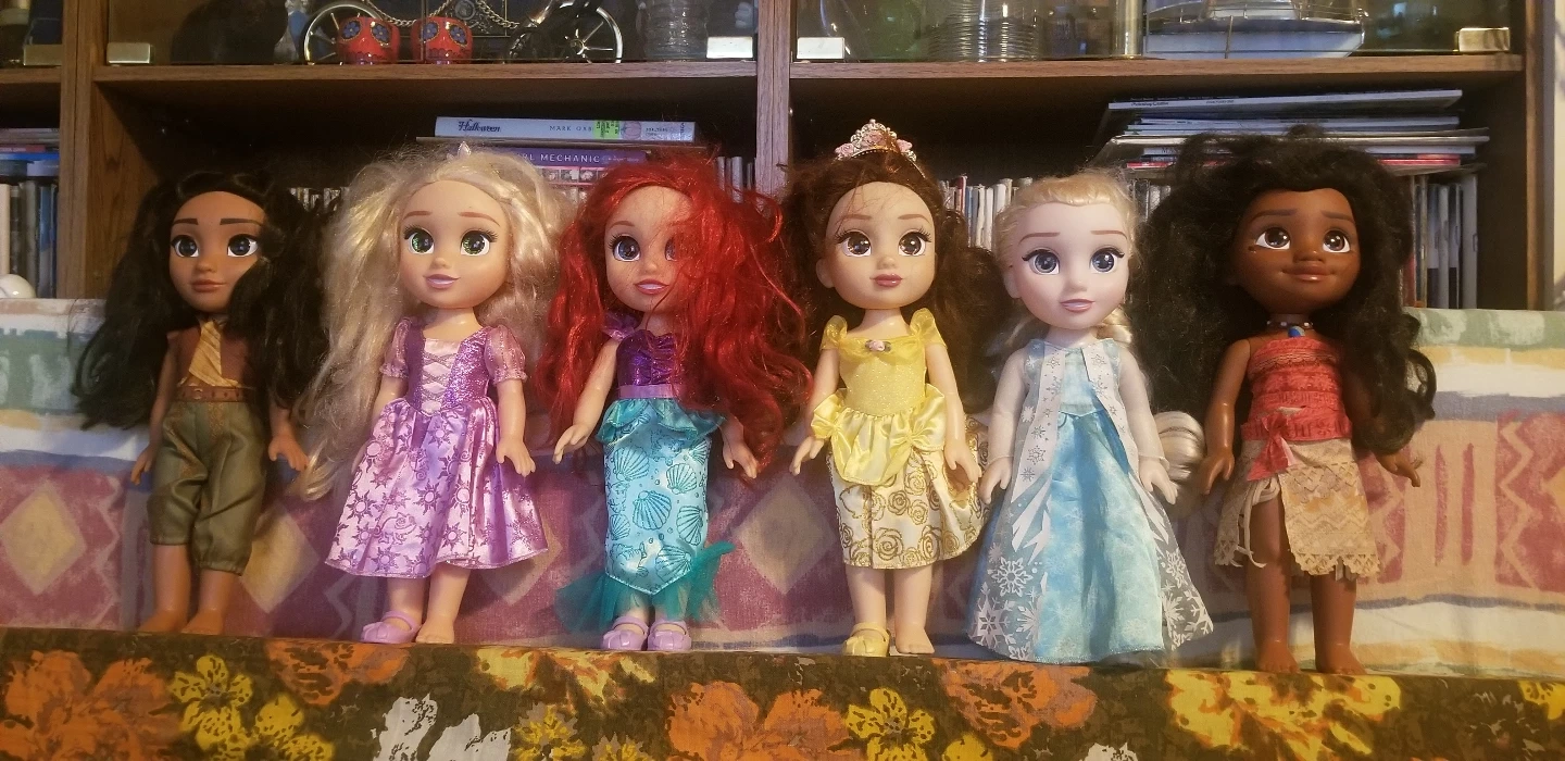 Six Disney Dolls , 14 inches tall , all in good condition , just need to brush their hair . one has shoes the others dont . all six sold together . cash payment please , thanks for looking .