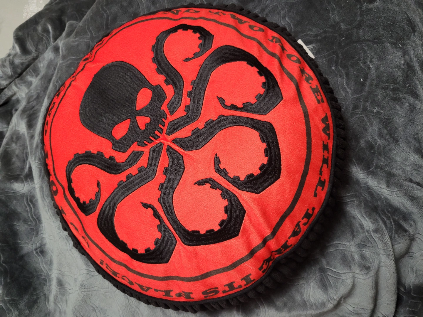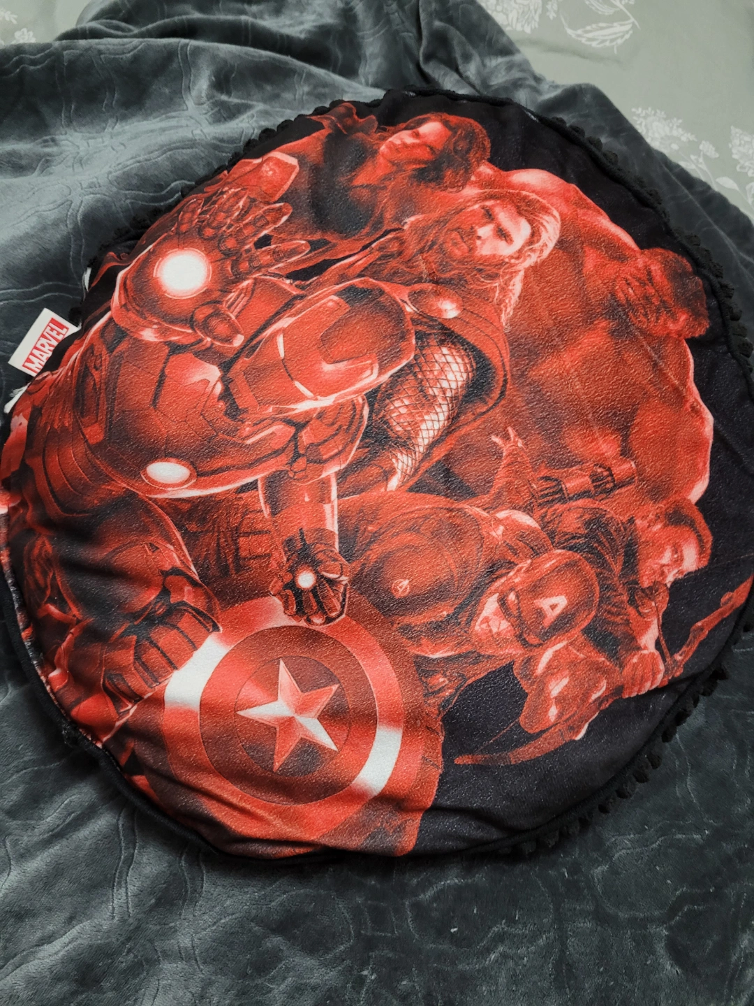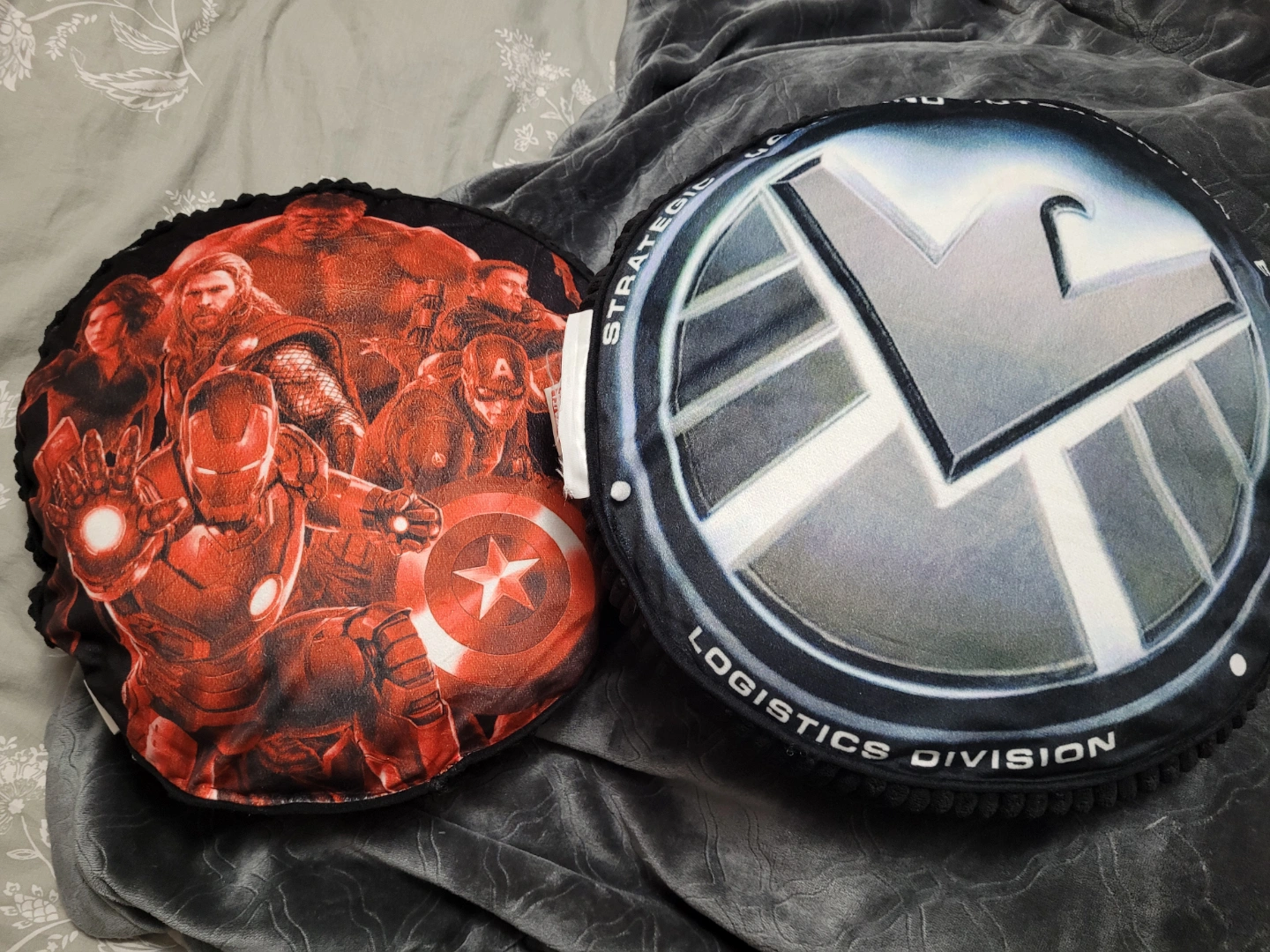 603Two round cushions featuring four Marvel designs. Avengers, SHIELD, Hydra. Soft and plush. Great for fans! Non-smoking home. Pick up only, Don Mills and York Mills area.