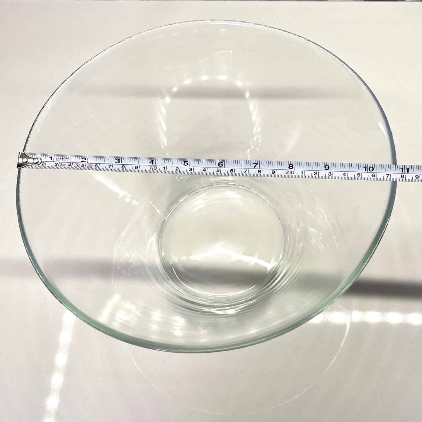 Large, clear glass serving bowl. Perfect for serving or as a decorative centerpiece. Approximately 11 inches in diameter.