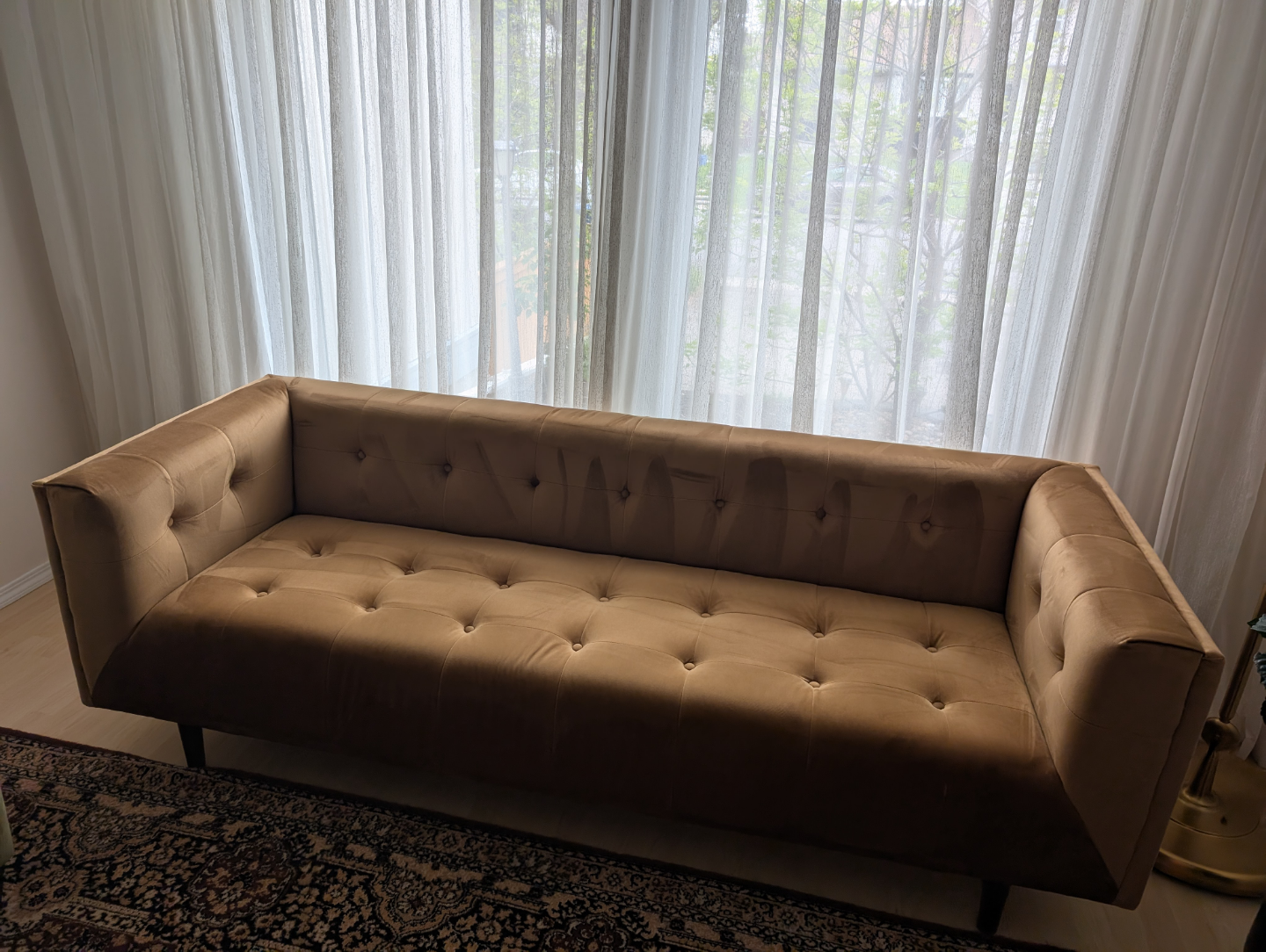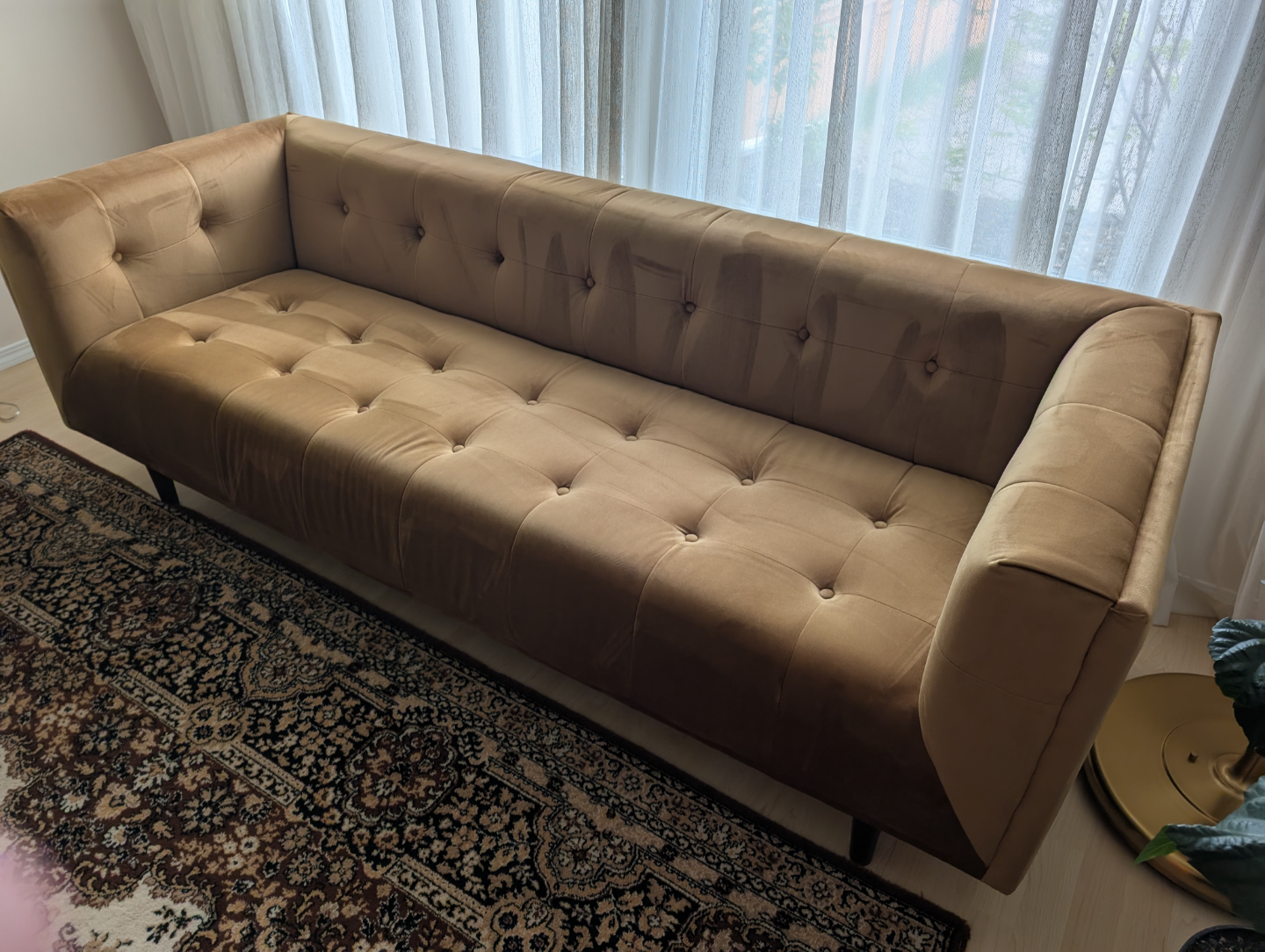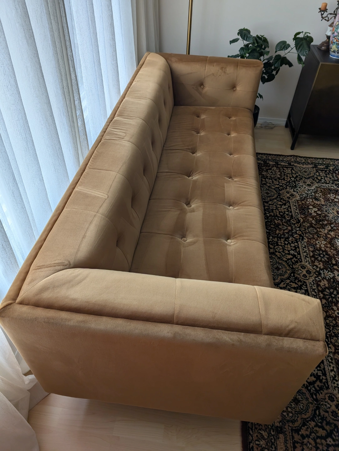 Button-tufted velvet sofa. Gold colour. Sleek mid-century modern design. Solid wood legs. Comfortable seating.