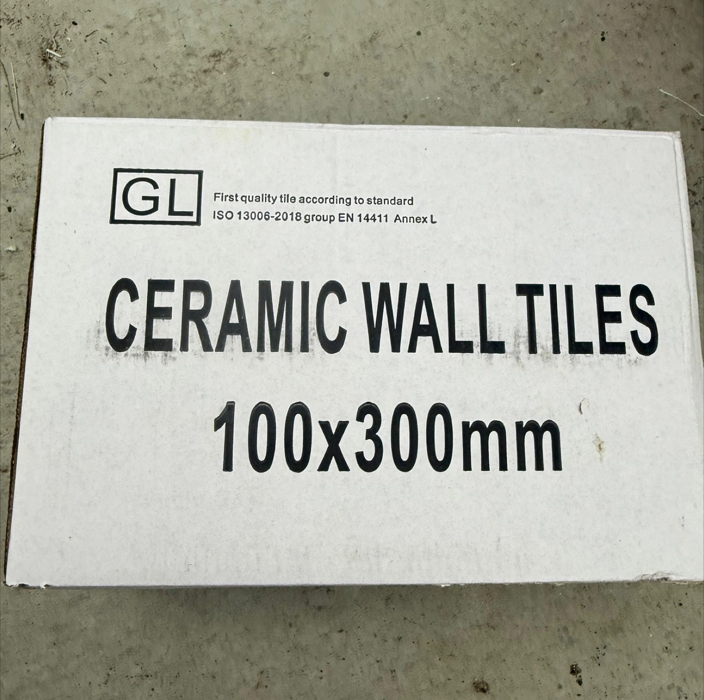 Unused box of ceramic wall tiles. White gloss finish. Measurements: 100mm x 300mm. First quality.