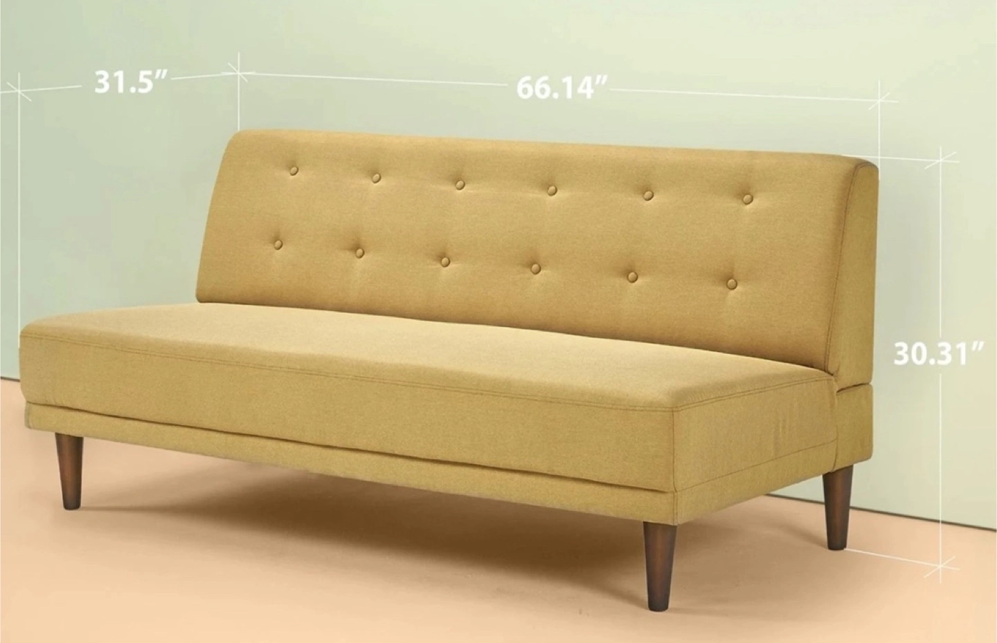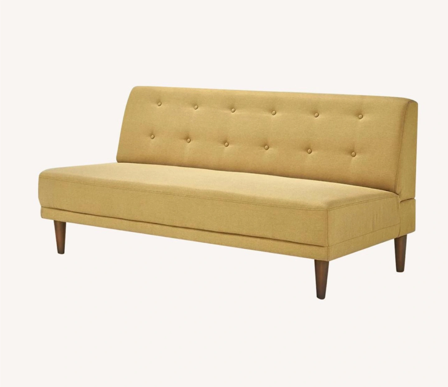 Mustard yellow fabric armless sofa. Mid-century modern style. Button tufted. Wooden legs. Compact size. Perfect for small spaces.