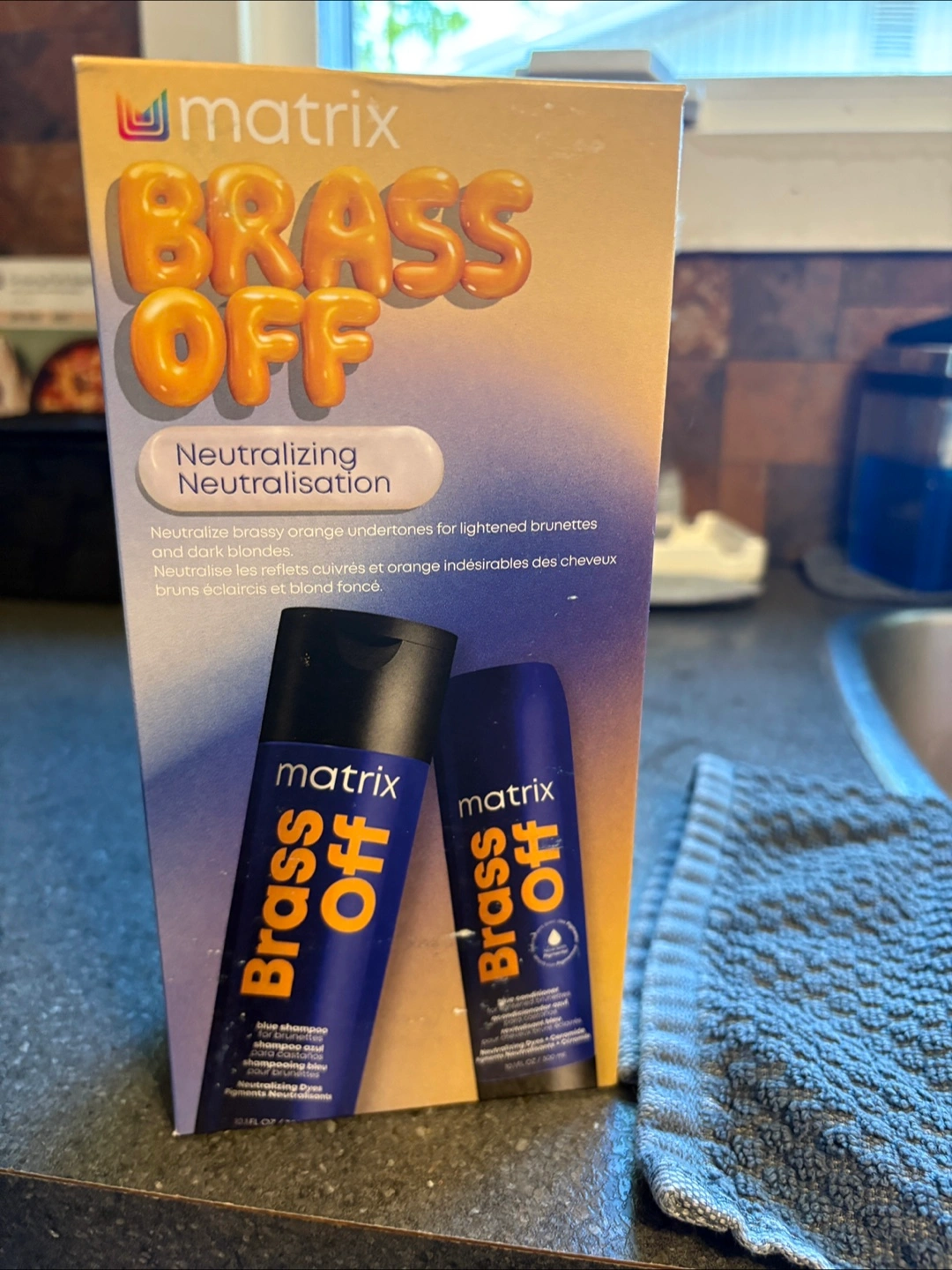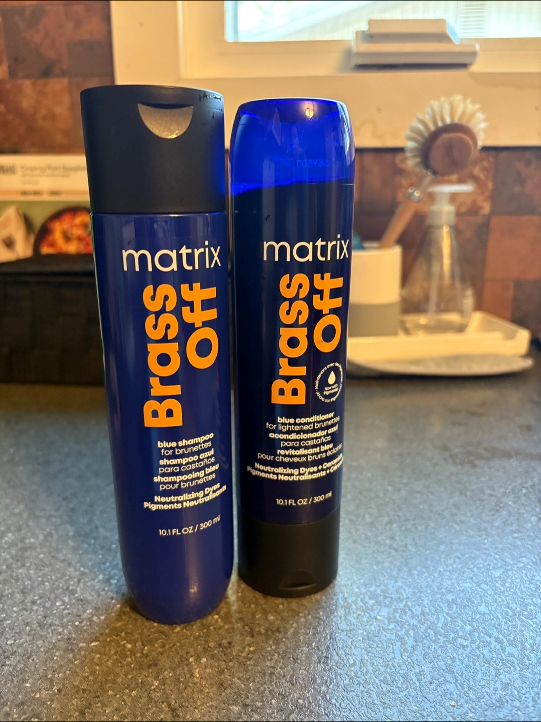 Matrix Brass Off shampoo and conditioner. Neutralizes orange and brassy tones in lightened brunette or dark blonde hair. Used once