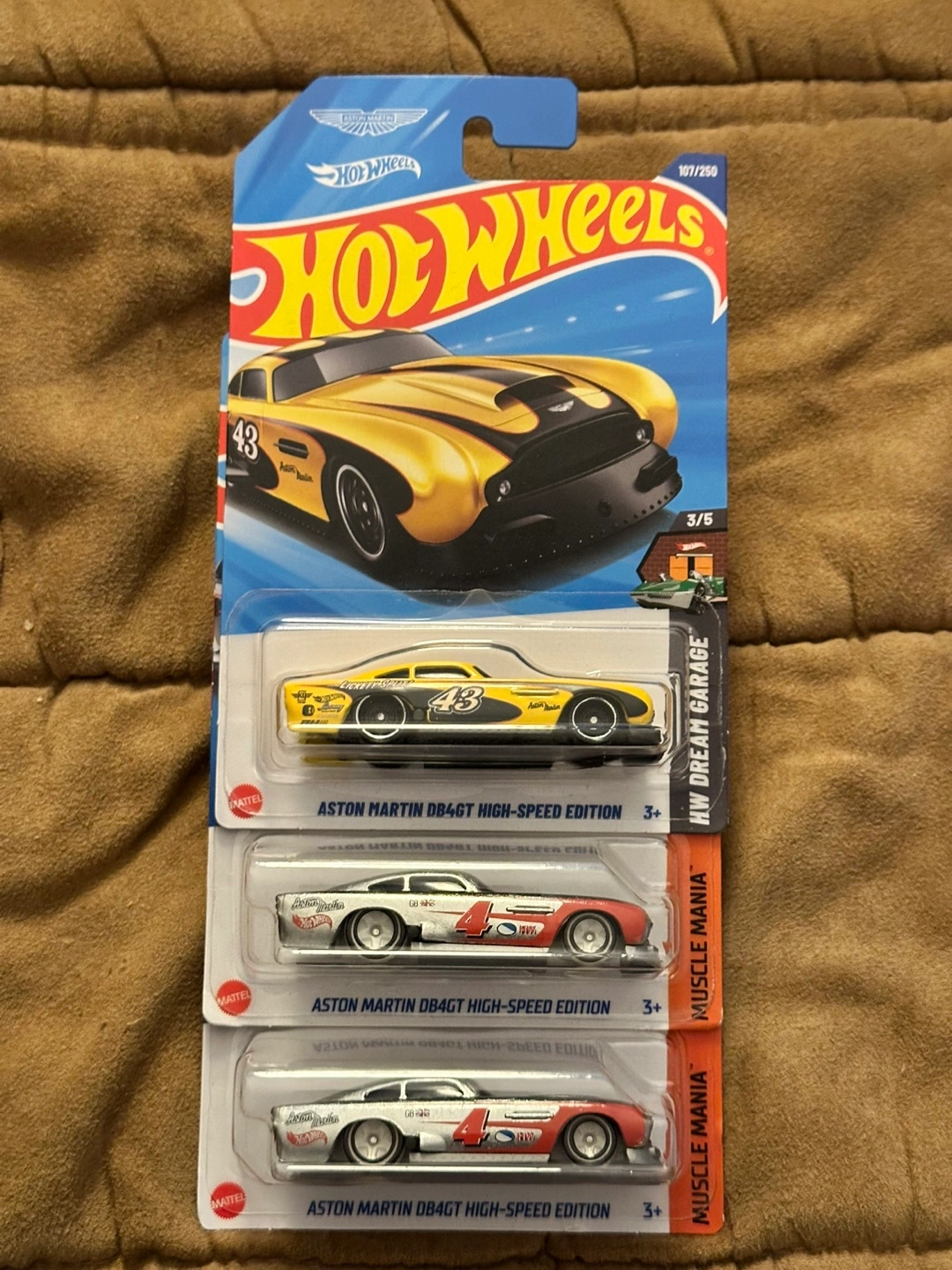 283Three Hot Wheels Aston Martin DB4GT High-Speed Edition cars. Collectible die-cast vehicles. Part of Muscle Mania and HW Dream Garage series. New in package. Price is for each