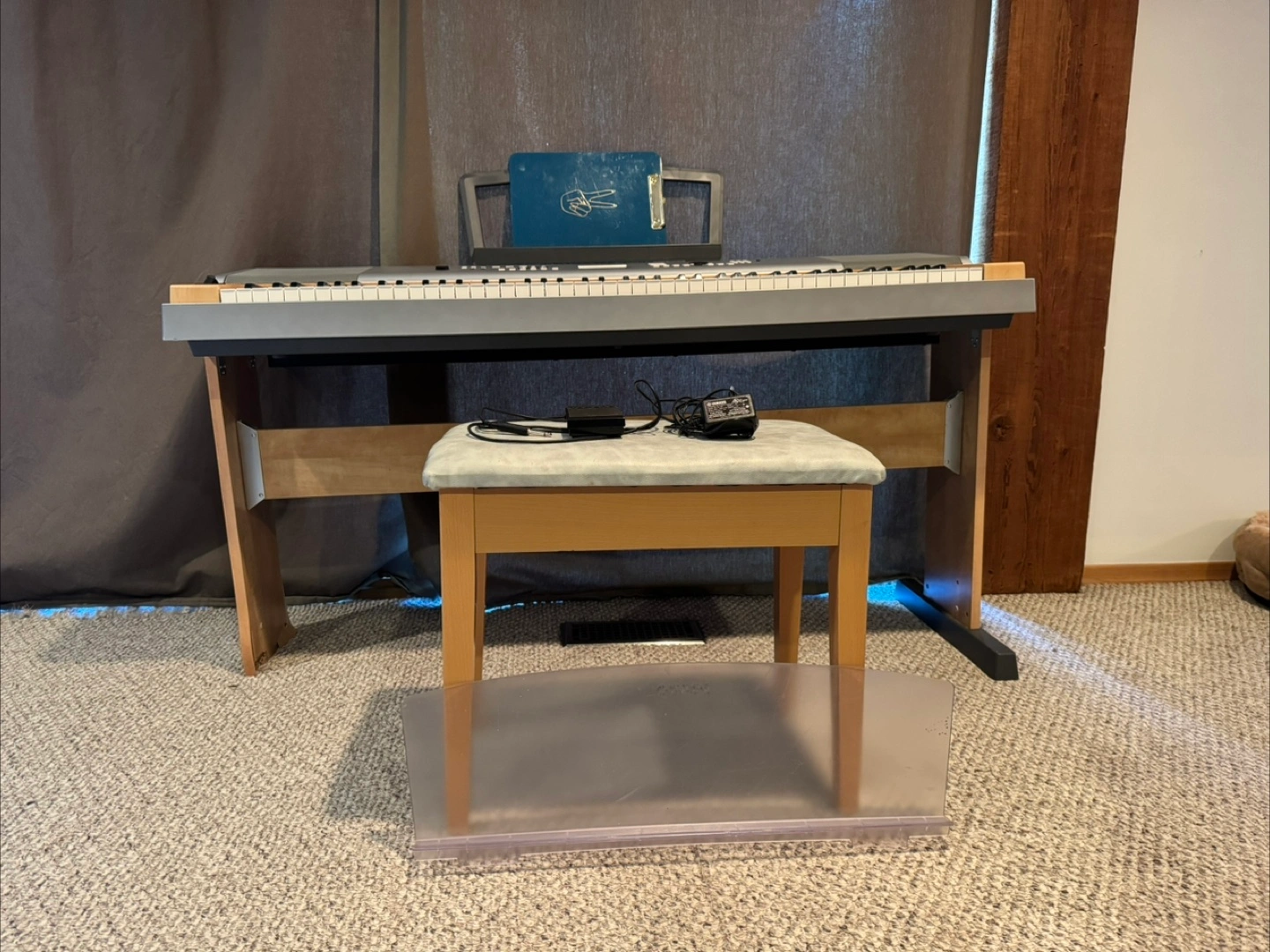 88-key digital piano, includes sustain pedal, power supply, music rest, and bench. Excellent condition, barely used. Great for beginners or experienced players.