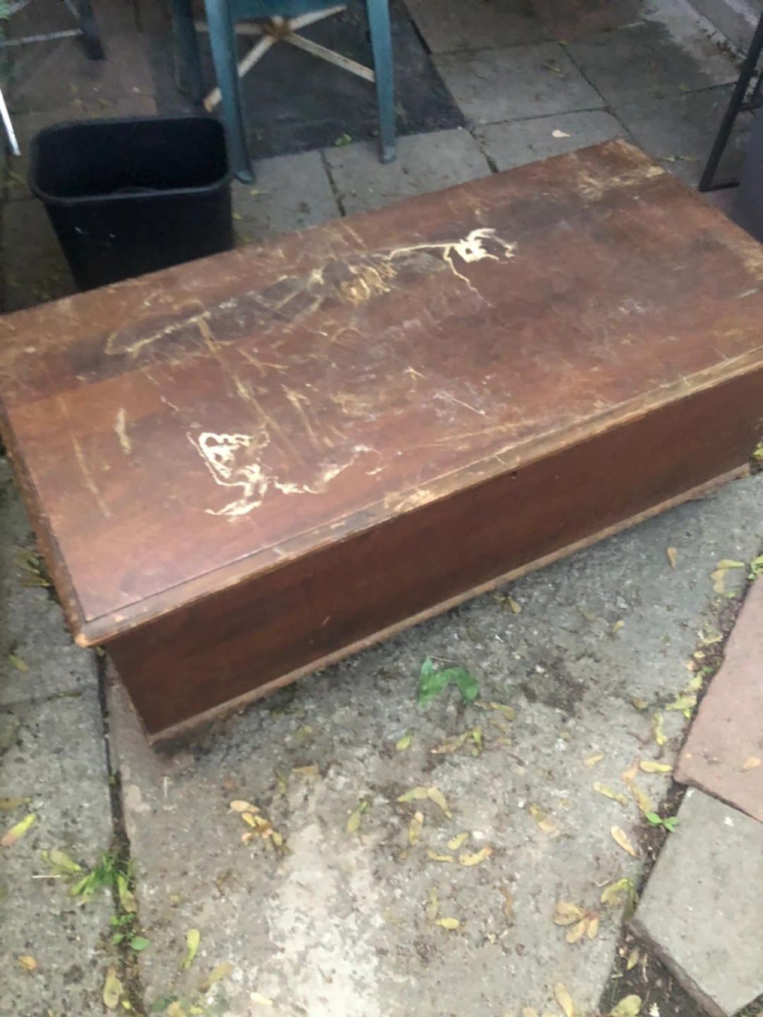 Antique cedar chest. Made of wood. Shows signs of age and wear. Spacious interior. Ideal for storage.