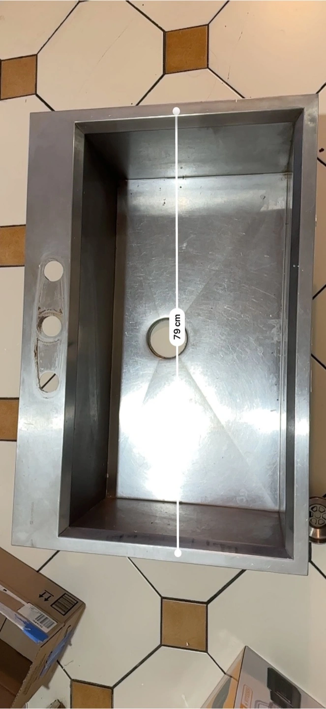 Large stainless steel kitchen sink. Measures 79cm. Three pre-drilled holes. Used good condition, selling because got one with double bowl