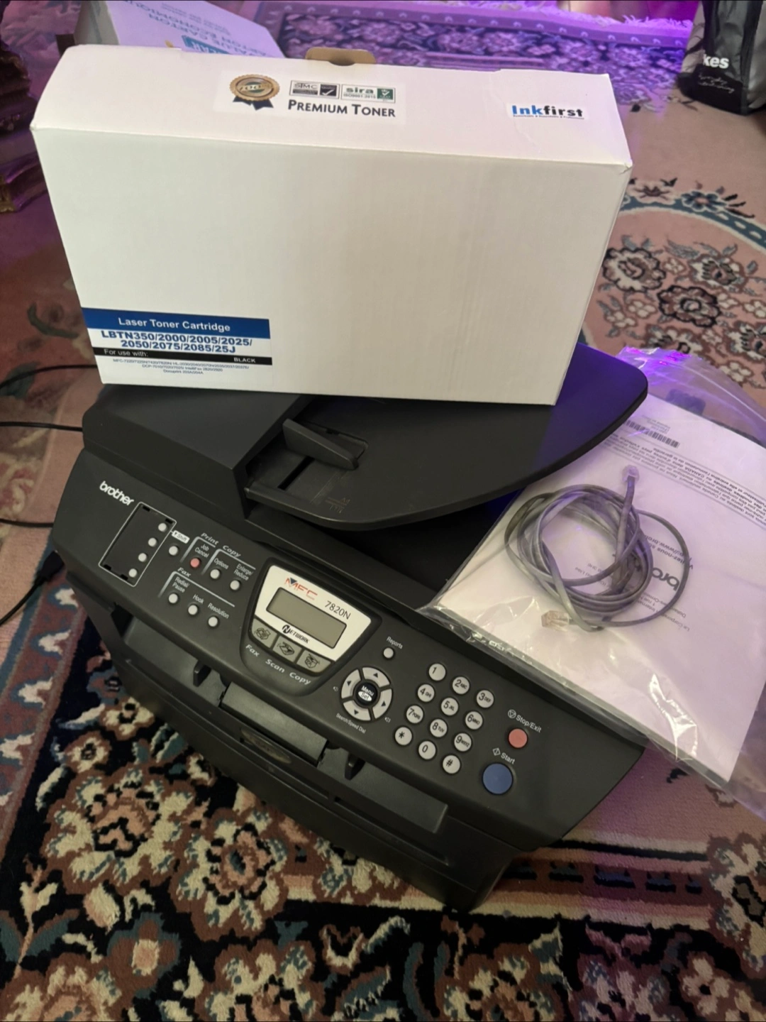 Brother MFC-7820N multi-function printer. Includes Inkfirst premium toner cartridge. Power cord and instructions included.