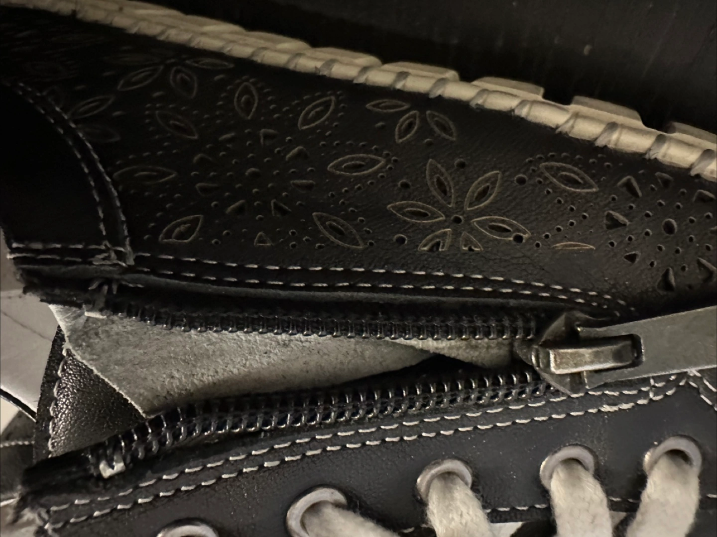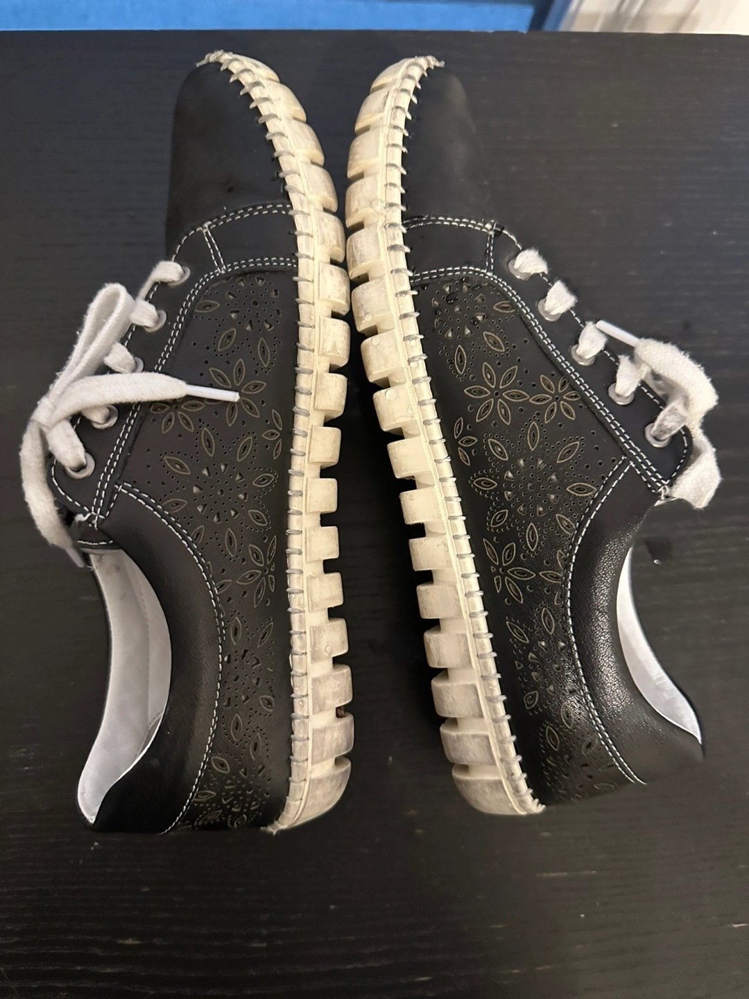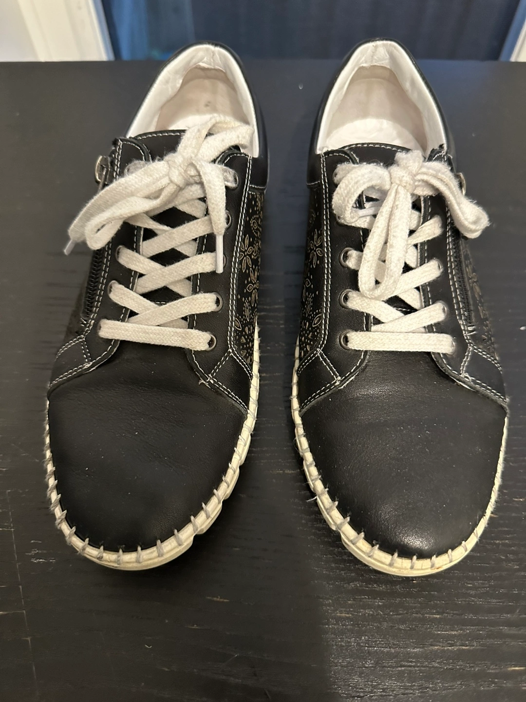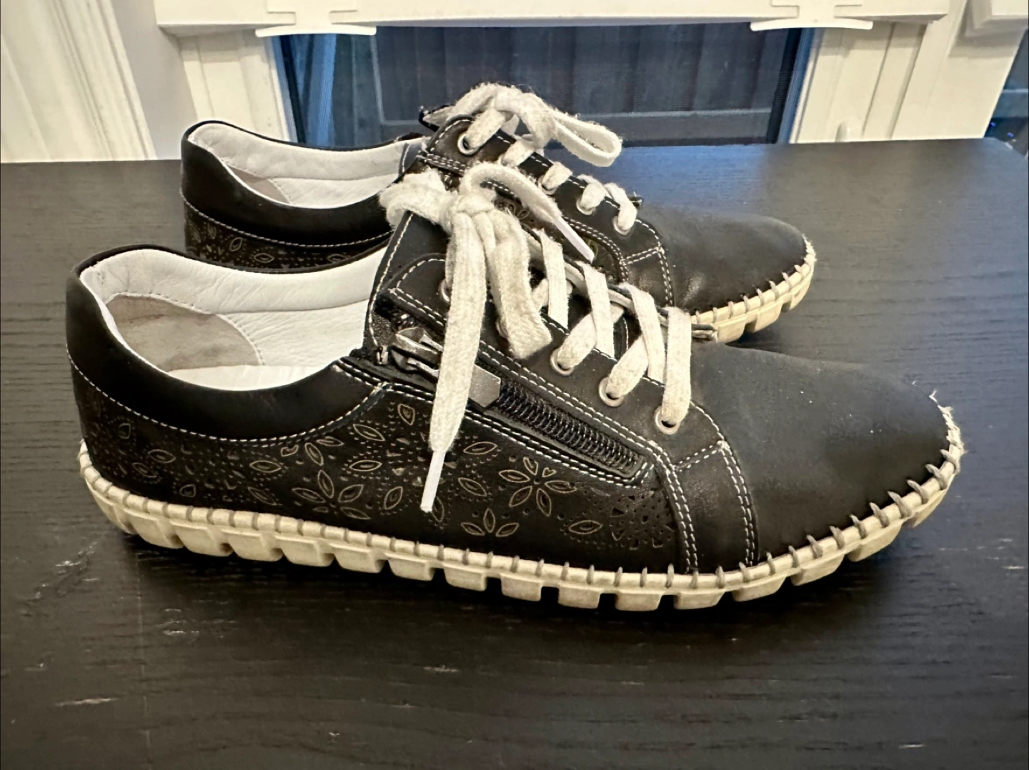 Black leather casual shoes. Lace-up design with side zipper. Floral detailing. Comfortable sole. Size 7.5 Women’s . Made in Turkey. - Retails for $149.99 .
