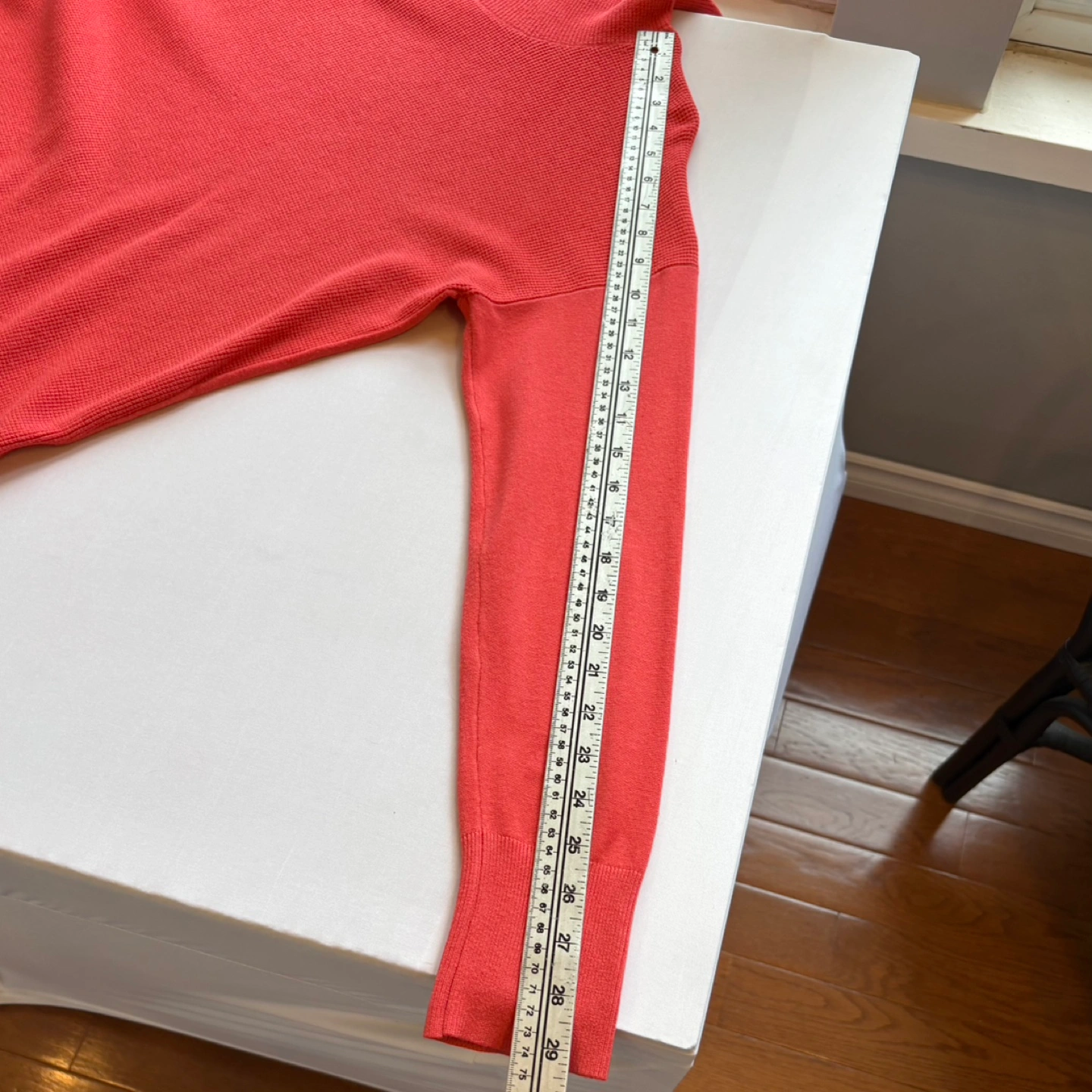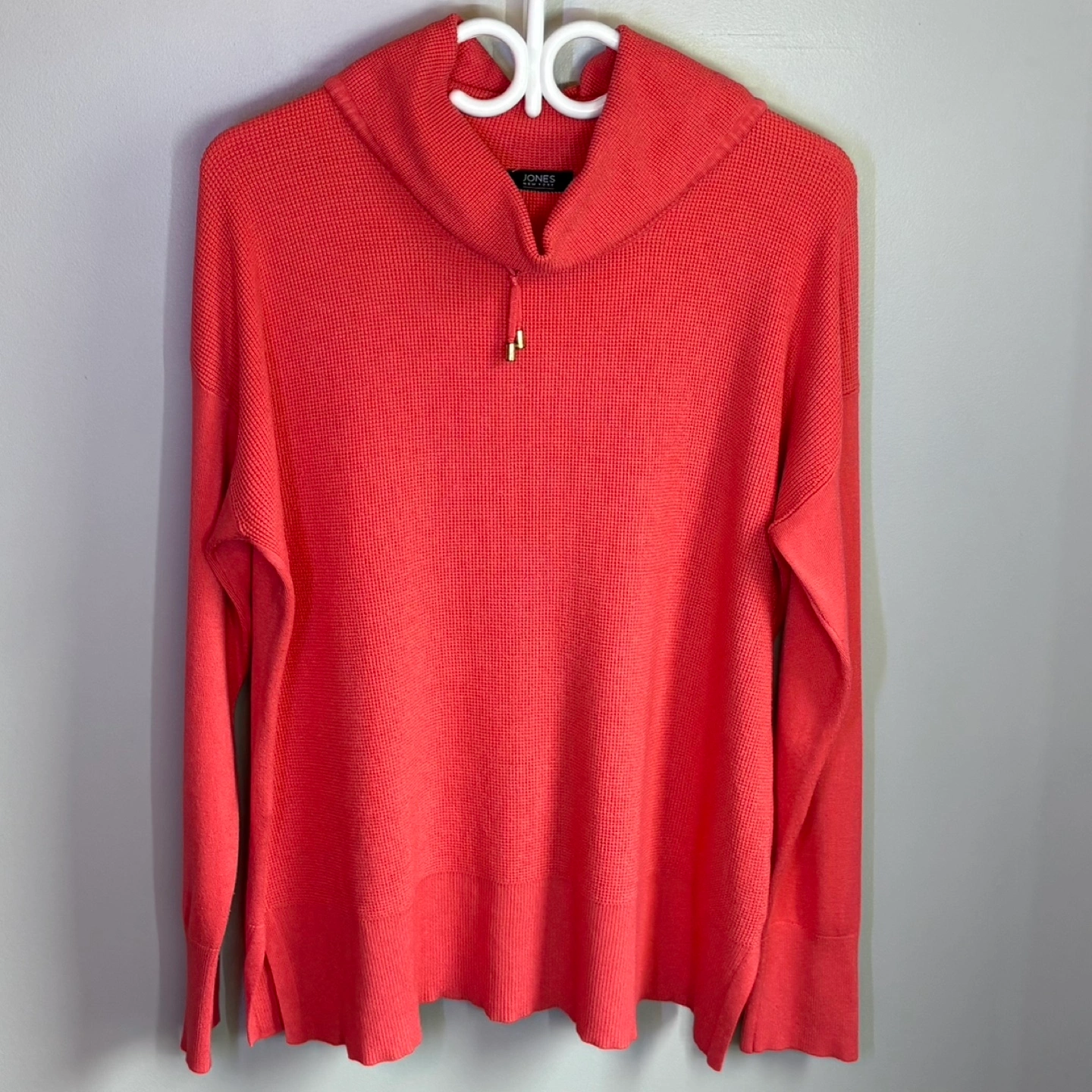 This is a Jones New York coral waffle knit cowl neck long sleeve sweater, perfect for adding a pop of colour to your wardrobe!