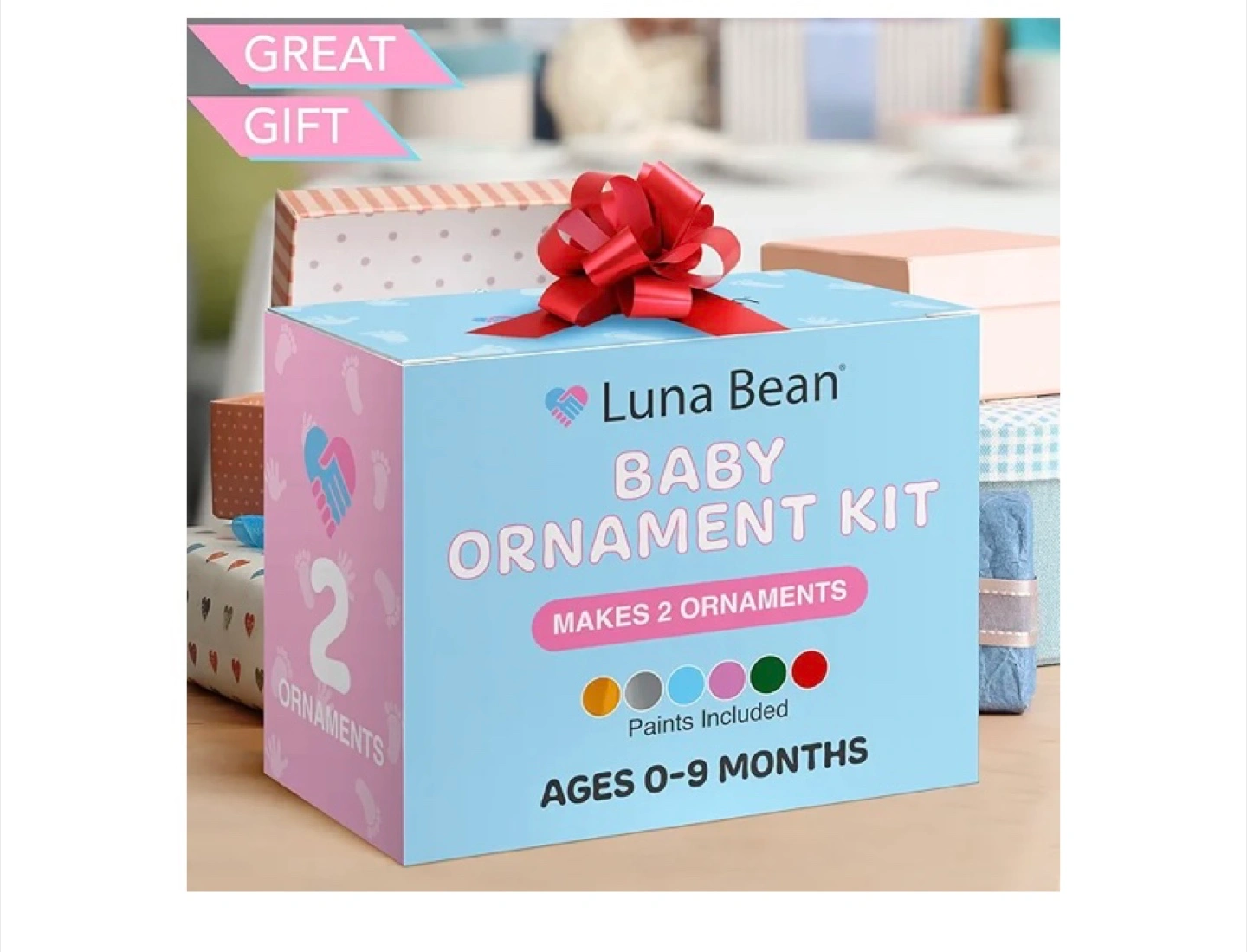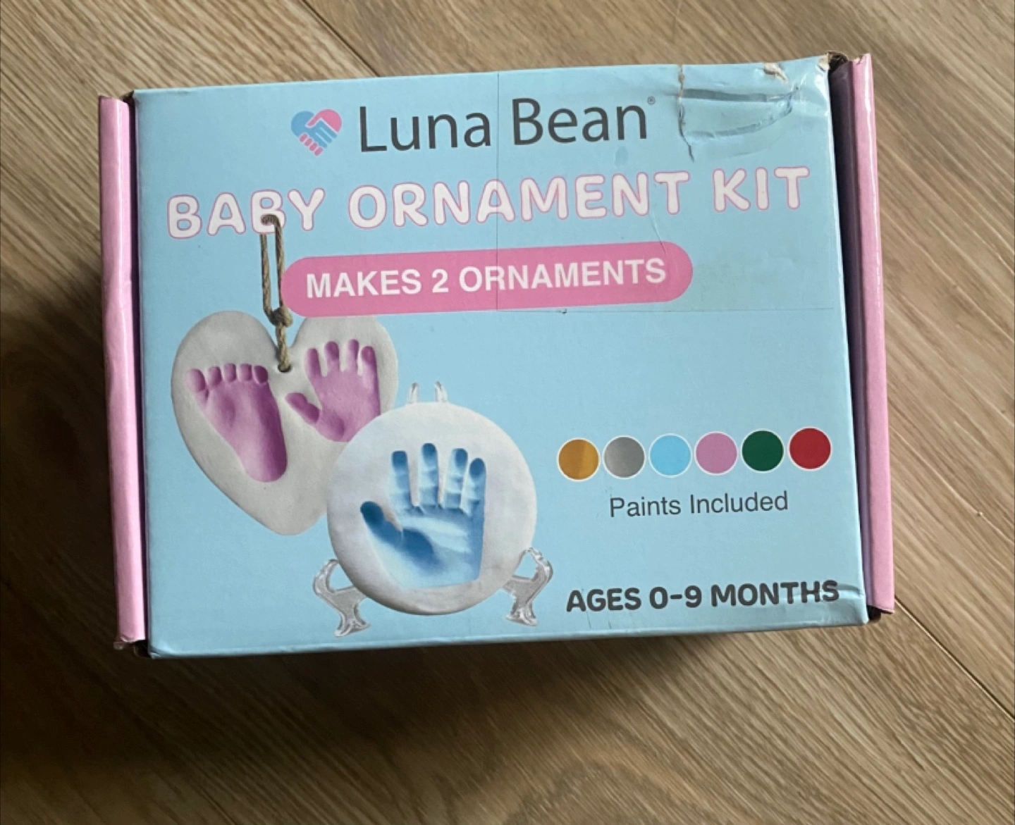 New baby ornament kit. Makes two keepsake ornaments. Includes paints. Ages 0-9 months. Great gift.