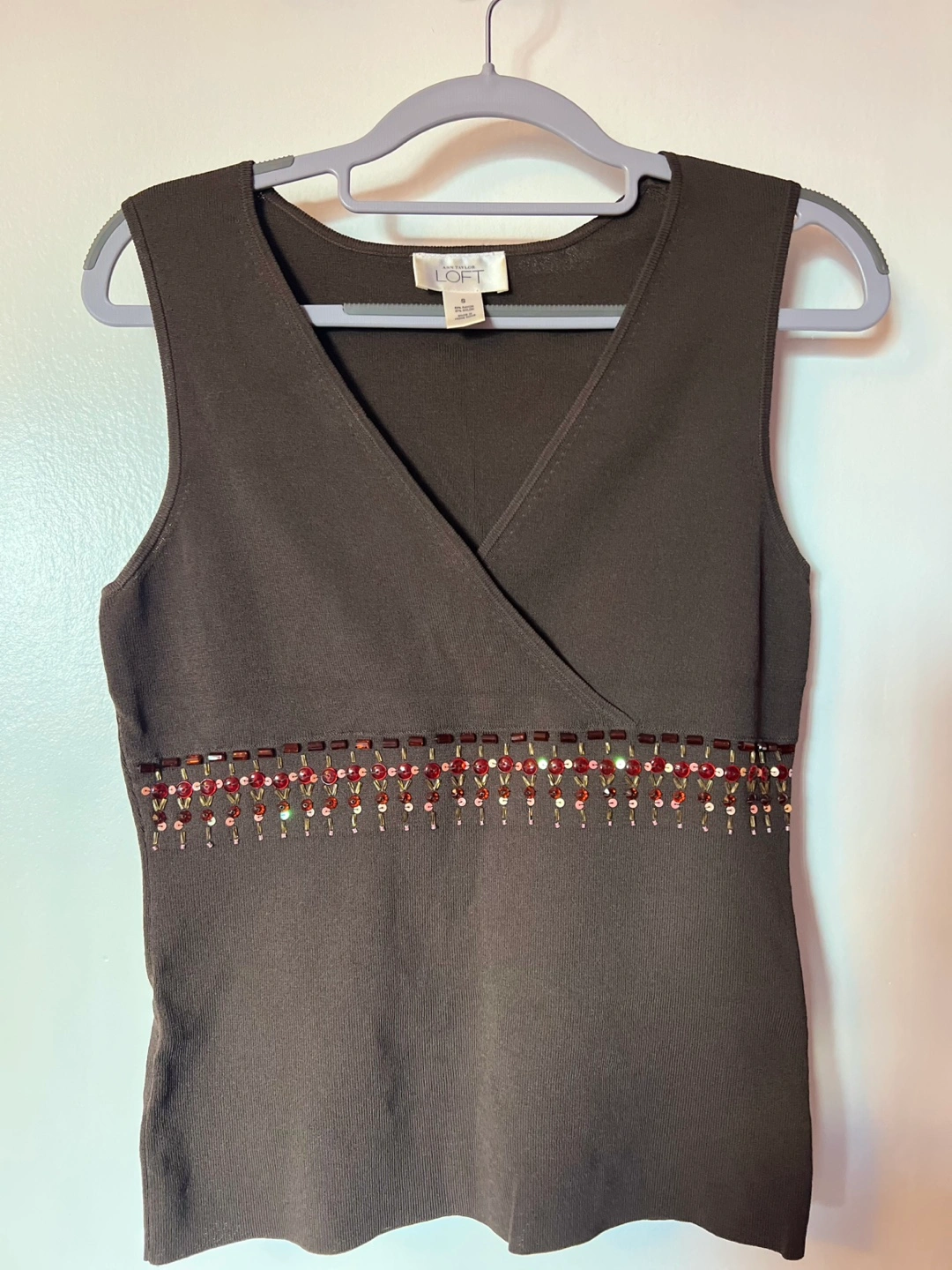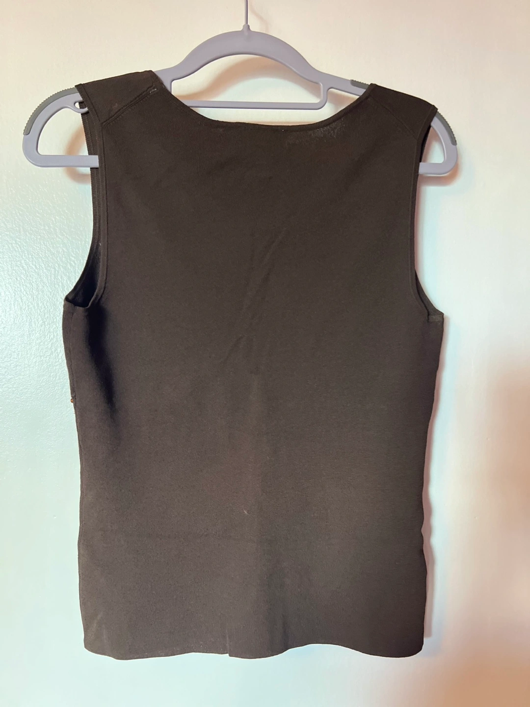 128Women's brown sleeveless knit top. Features a V-neck and a beaded detail around the waist. Size S. Great for layering or wearing alone.