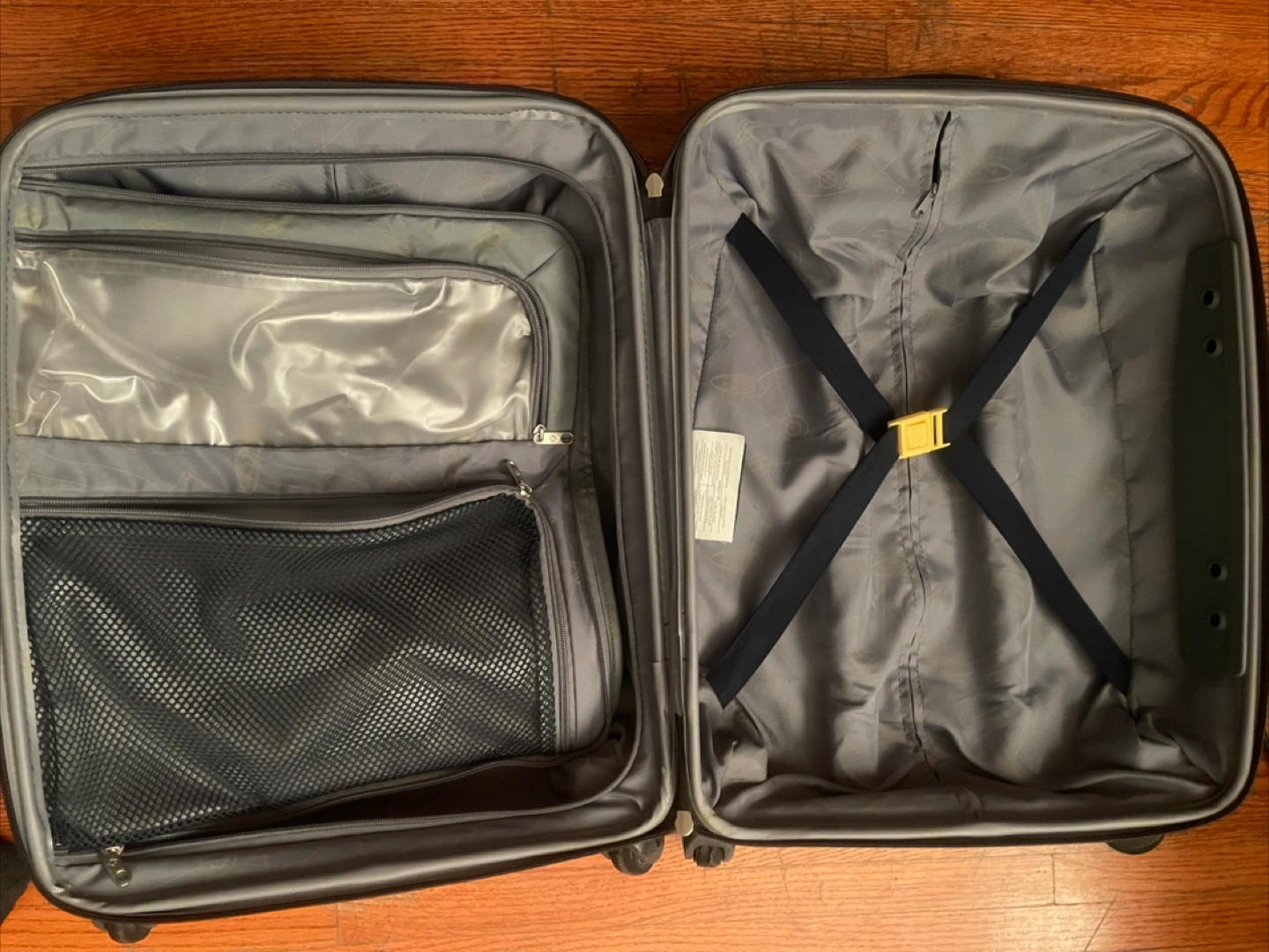 Dark-grey carry-on suitcase. Four wheels. Multiple compartments inside. Minor wear and tear, as shown in images, doesn’t affect the function, or the inside of the suitcase.