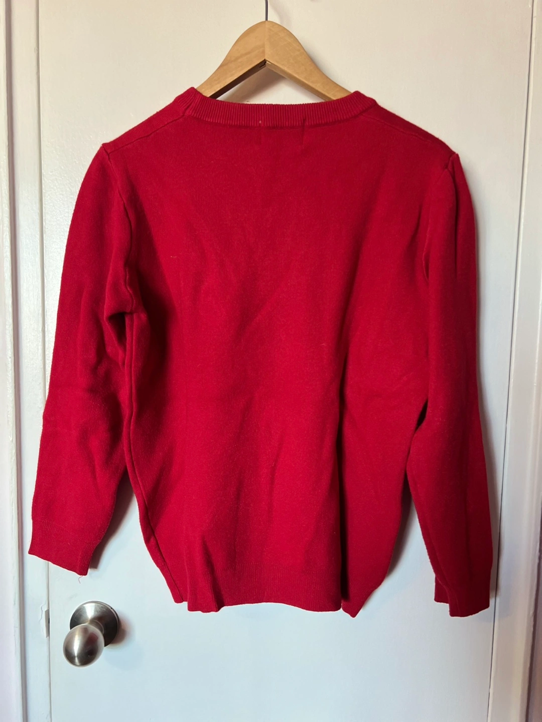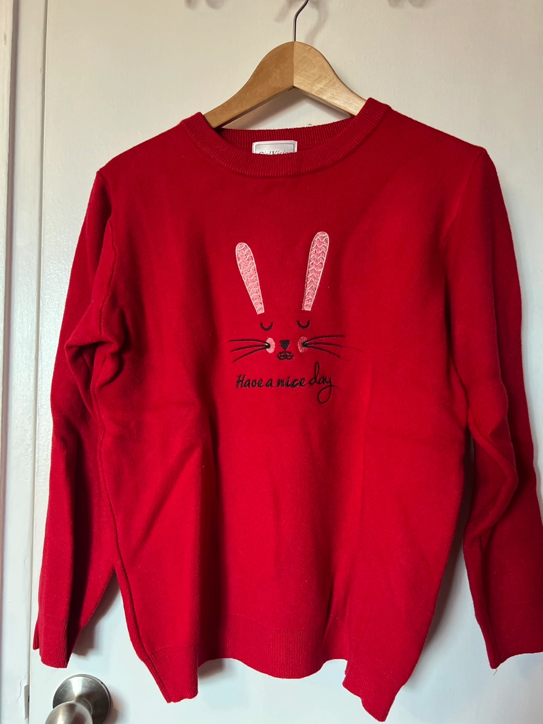 128Women's red long-sleeve sweater. Features embroidered bunny face and the phrase "Have a nice day." Crew neck. Lightweight knit.