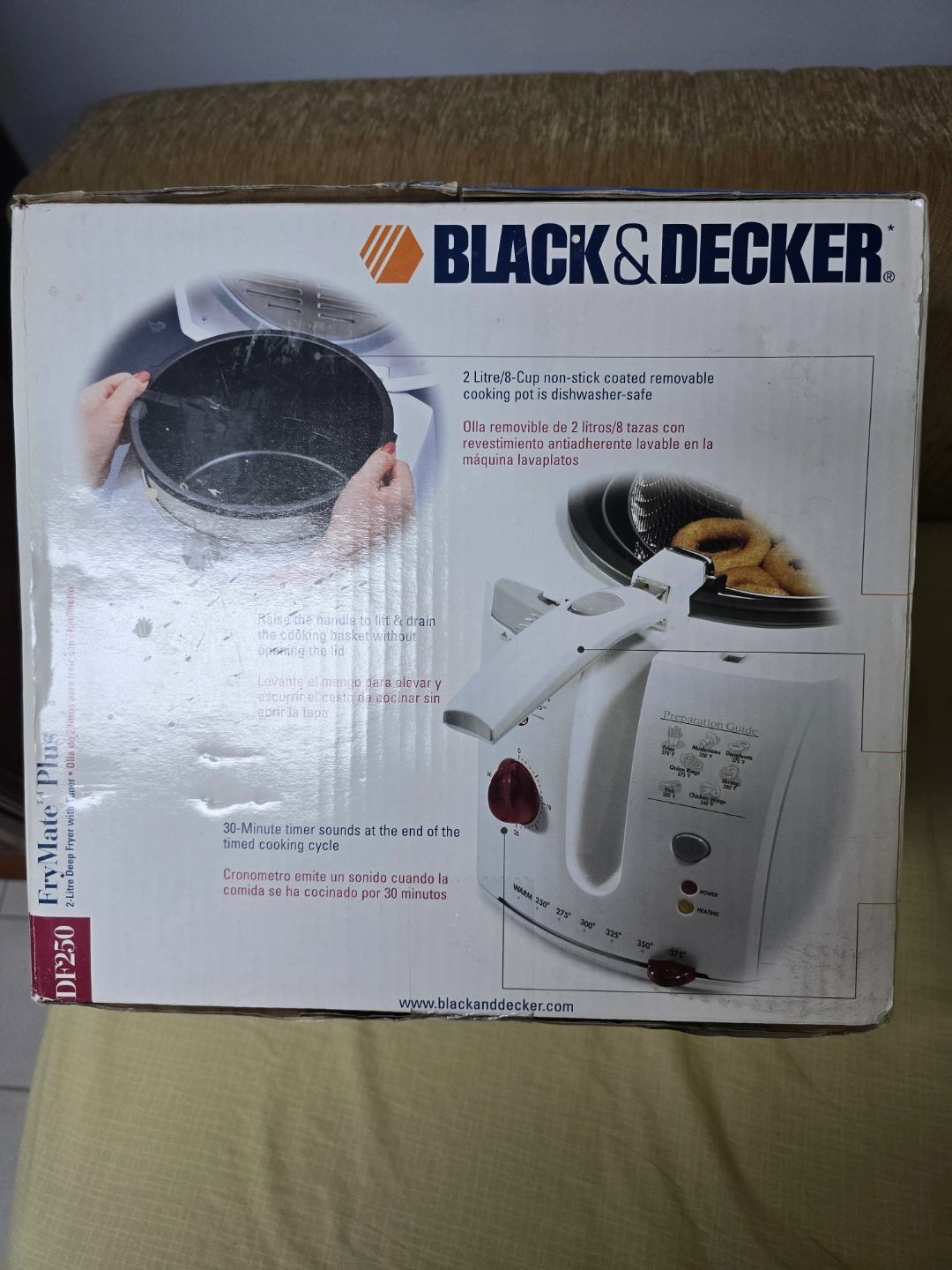 2-liter deep fryer. Features a 30-minute timer, removable pot, and cool-touch exterior. New in original box. Dishwasher-safe parts.