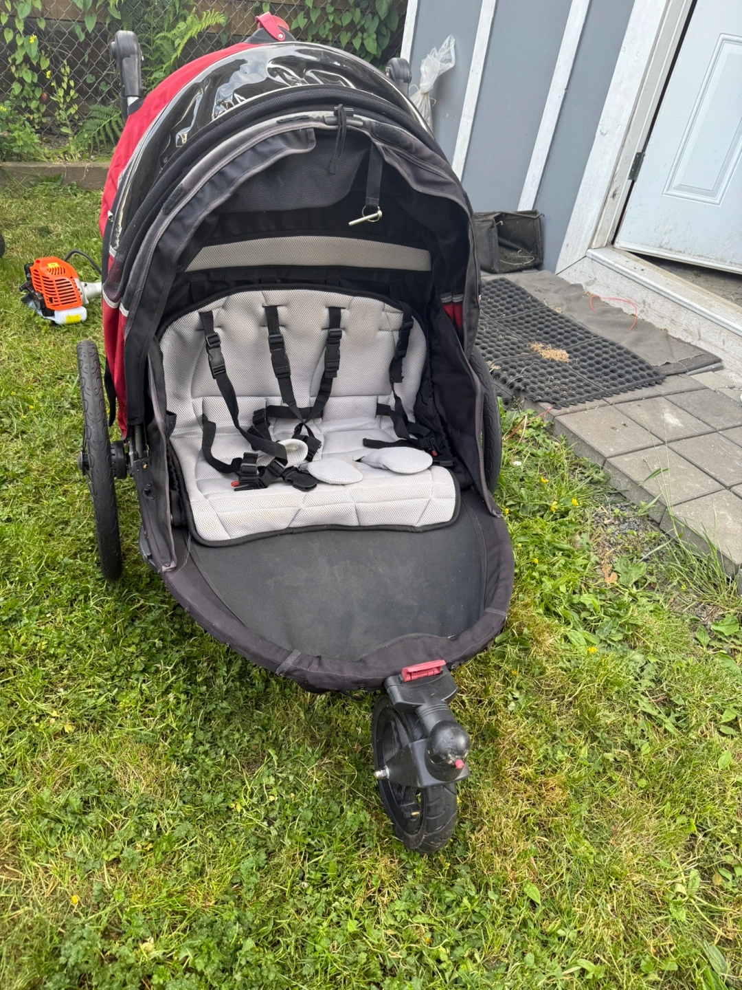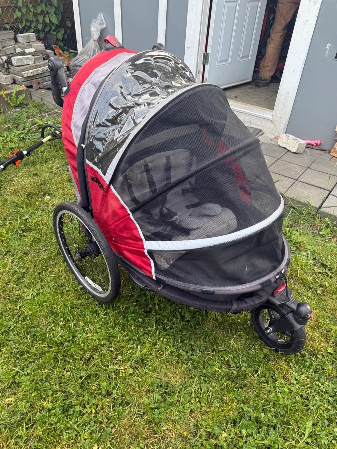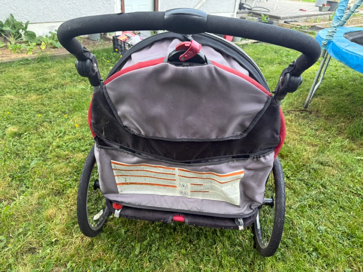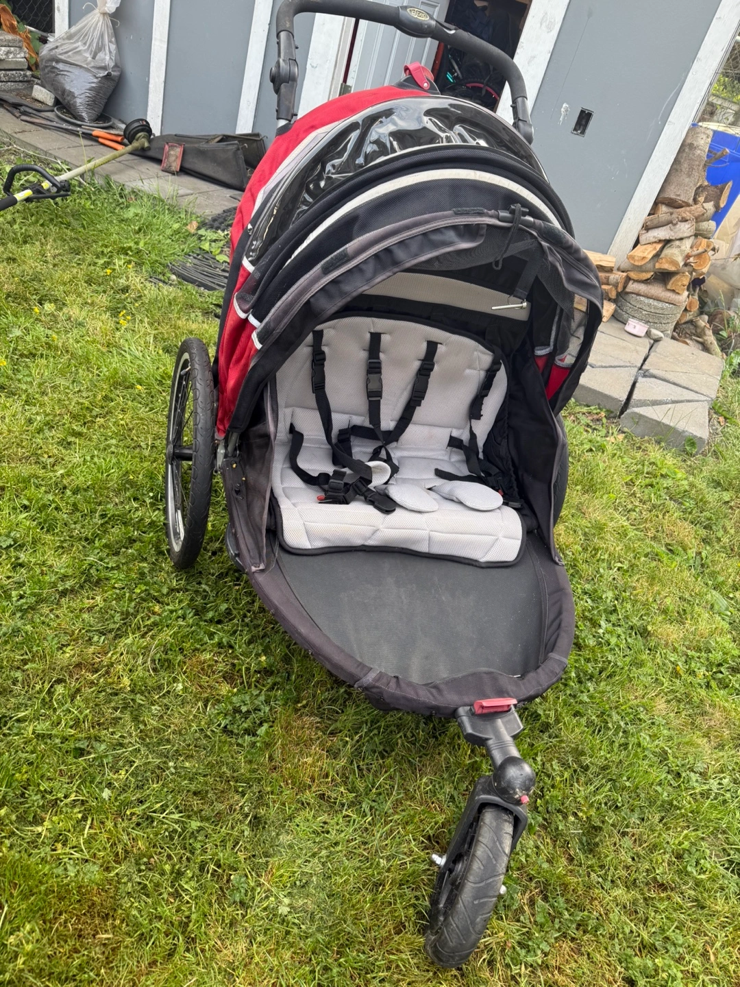 Double child jogging stroller. Red and black. Three wheels. Features a canopy and safety harnesses, waterproof cover , hand brakes. Storage pockets included. Bike Bicycle Trailer Coupler Attachment Angled Elbow for InStep & Schwinn Bike Trailers