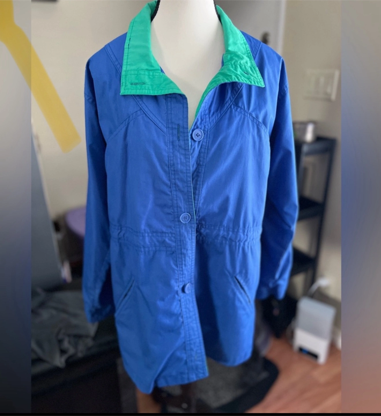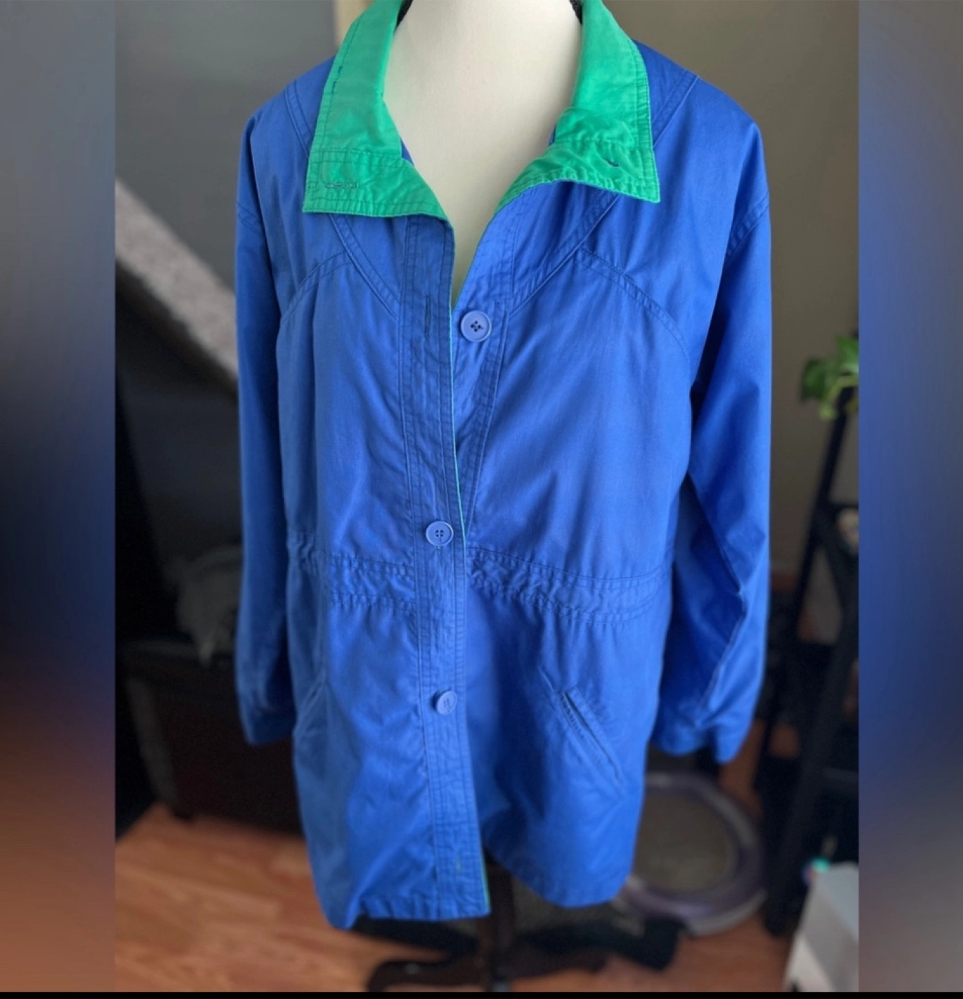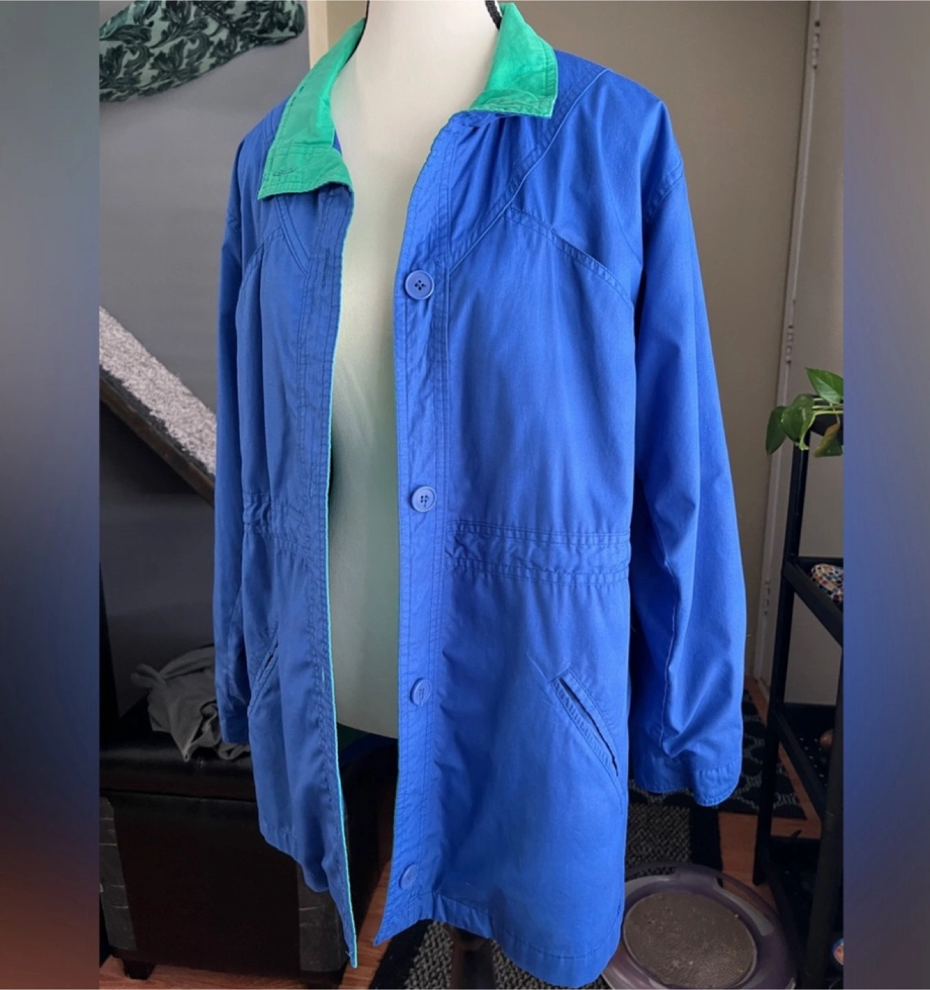 Women's long-sleeve button-up jacket. Size 8 (M) Outer Shell - Cotton & Polyester Inner Lining - nylon Drawstring waist. Pockets.