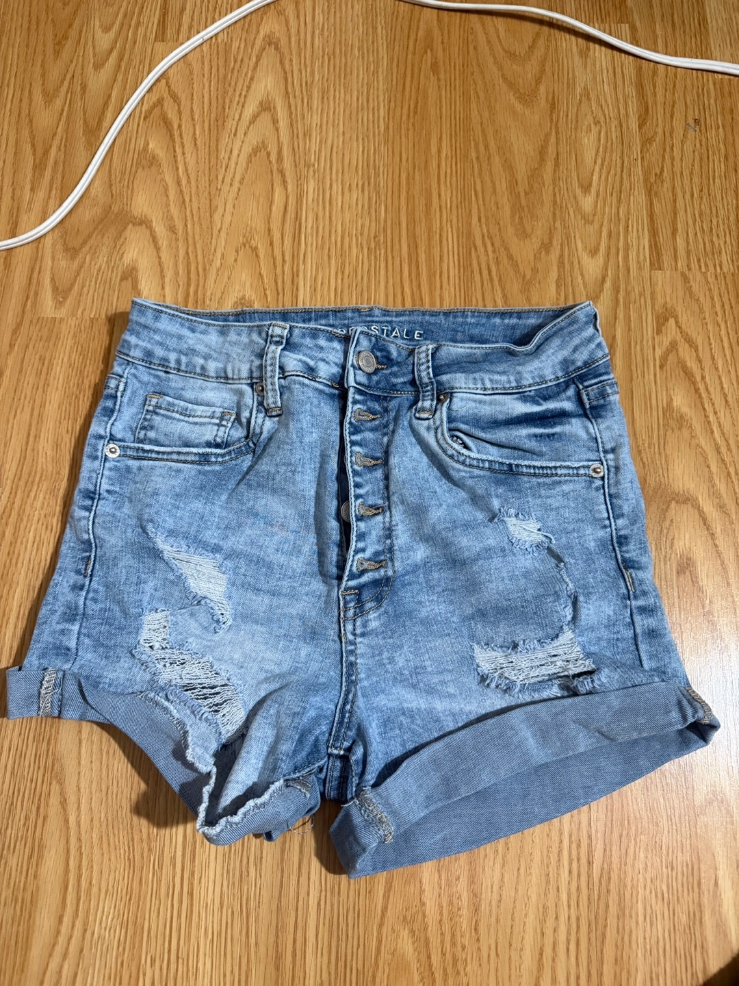 Two pairs of women's denim shorts. One light wash, distressed, with button fly. One darker wash, no distressing, zip fly. Both pairs appear to be high-waisted. 10$ for 1 20$ for both
