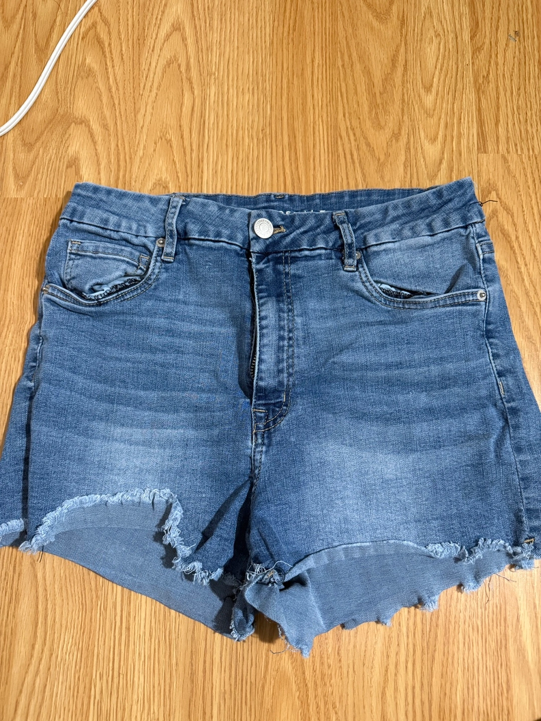 Two pairs of women's denim shorts. One light wash, distressed, with button fly. One darker wash, no distressing, zip fly. Both pairs appear to be high-waisted. 10$ for 1 20$ for both