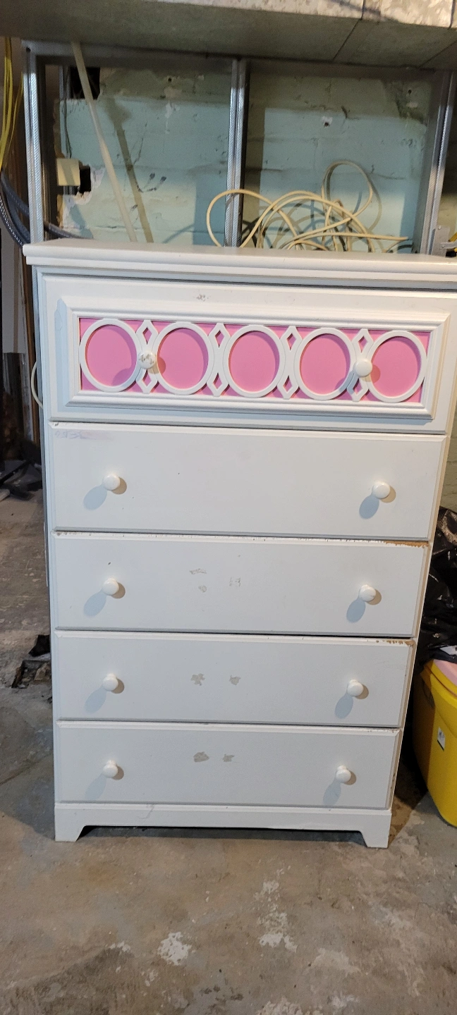 Five-drawer dresser, white with 4 different interchangeable coloured circles. Some minor wear and tear just needs to be painted.no chips or cracks. Good storage solution for a child's bedroom.