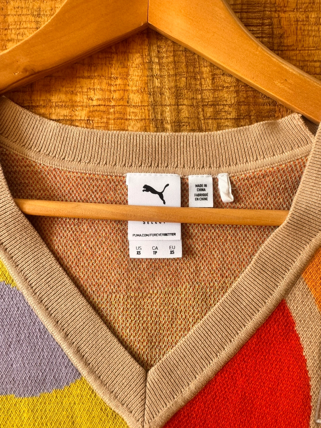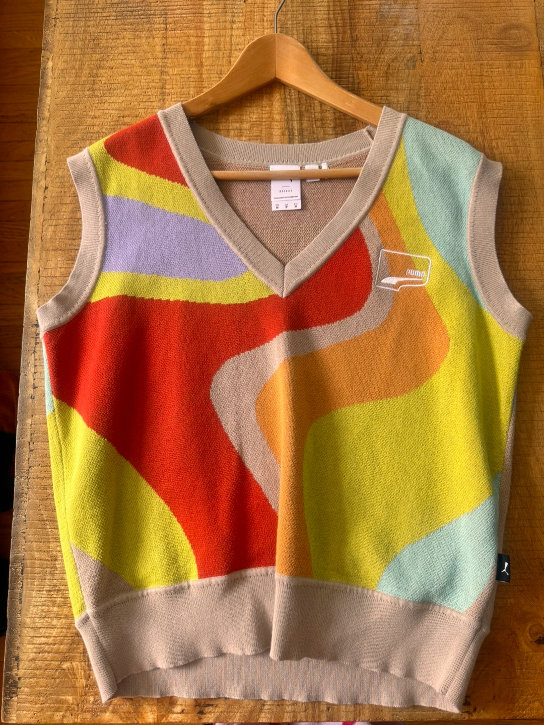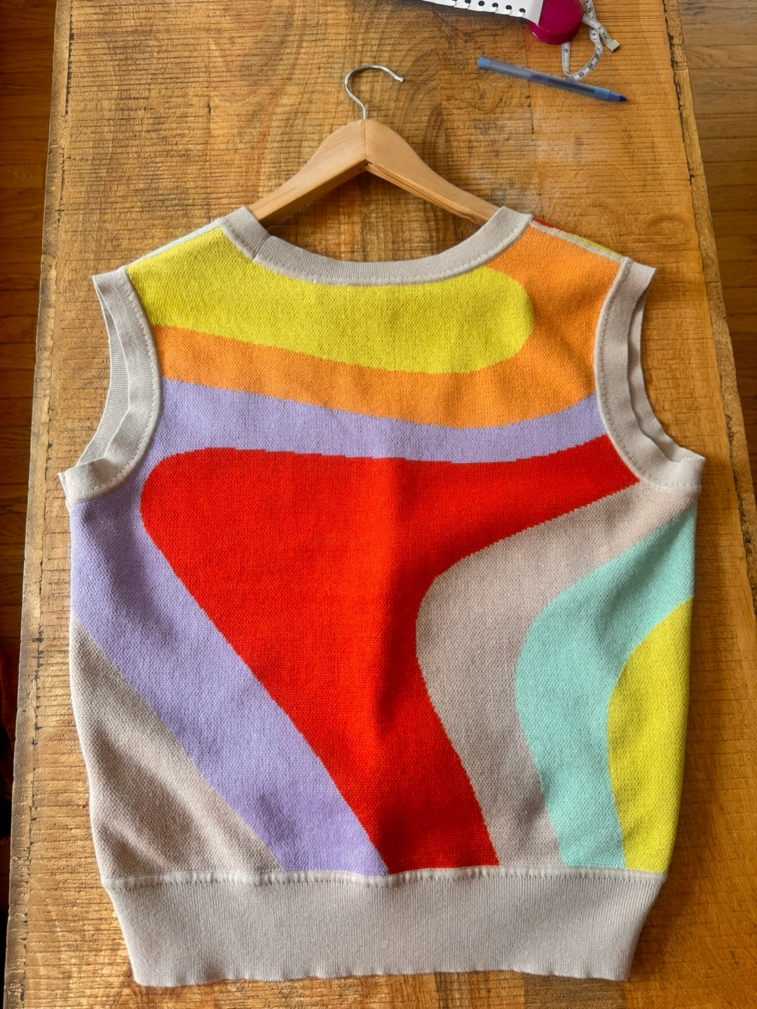 Colorful knit vest. V-neck. Sleeveless. Abstract pattern. Made in China. Size XS.