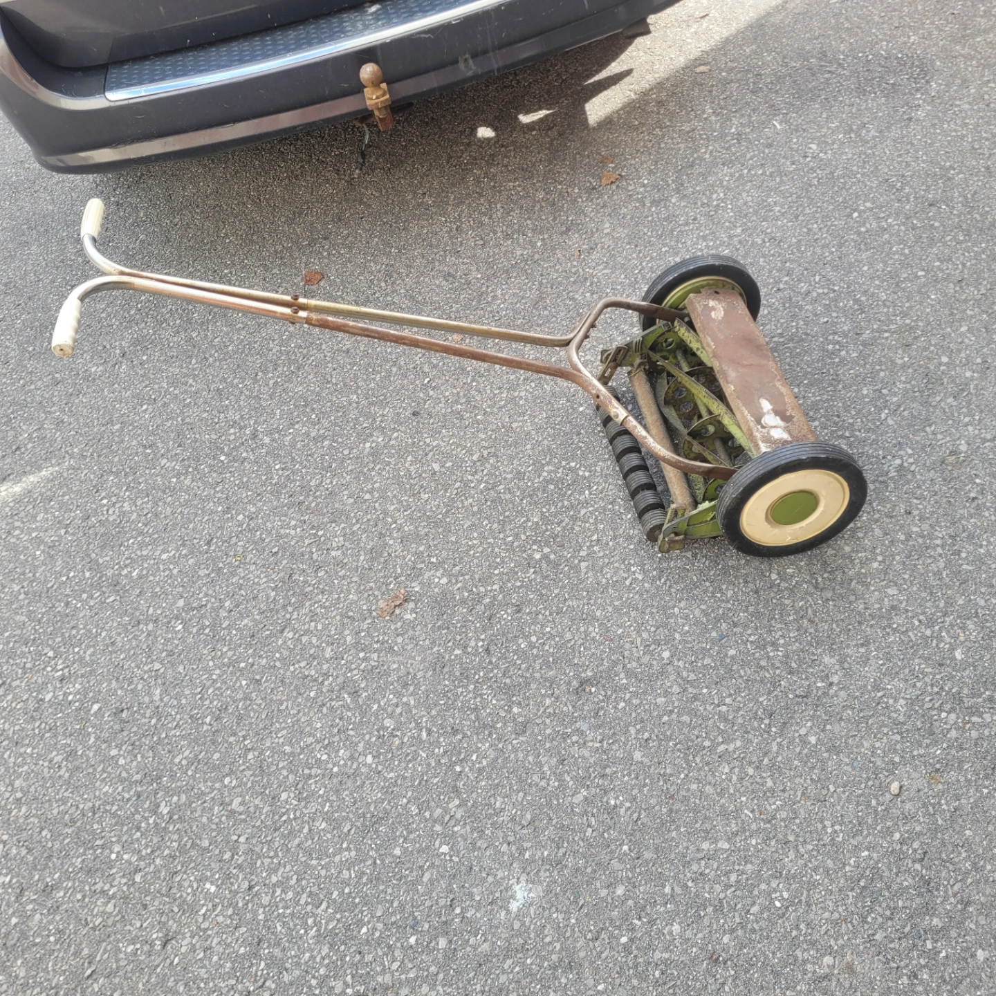 Antique push reel lawn mower. Metal construction. Wooden handles. Shows wear from age and use. Great for a collector or small yard.