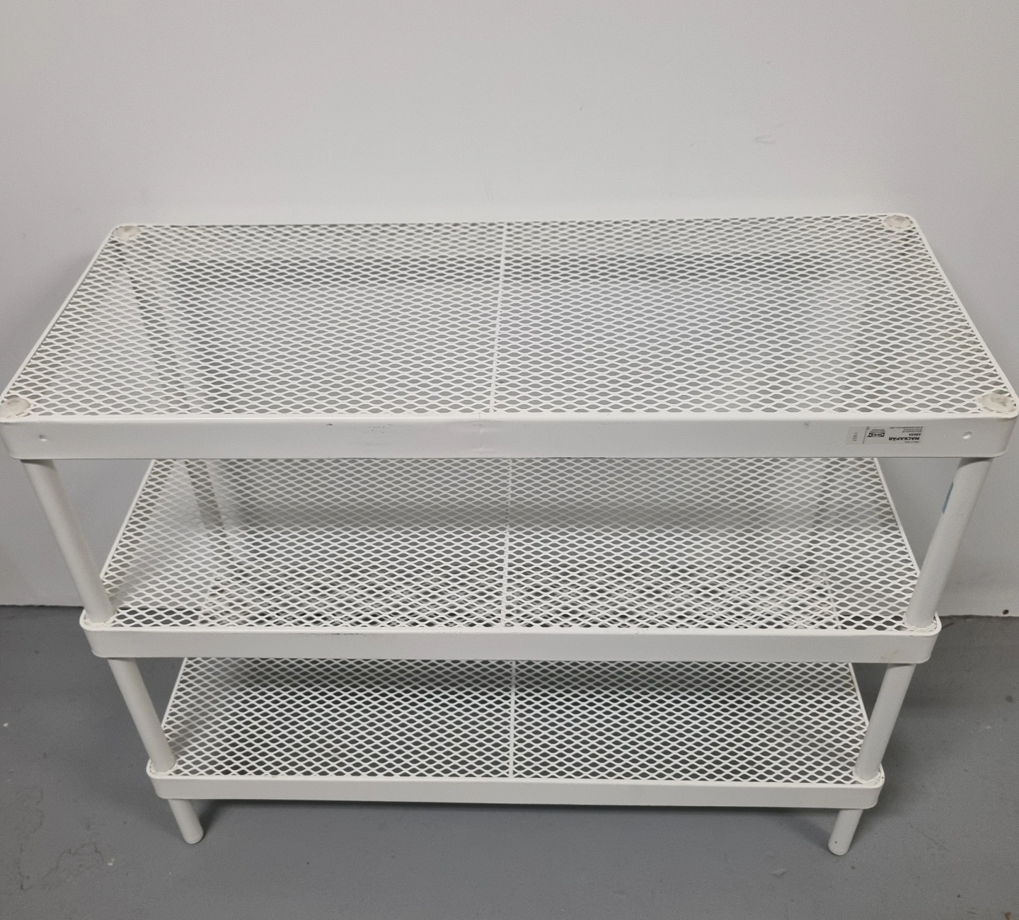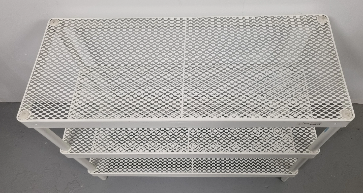 Three-tiered white metal shelving unit. Mesh shelves. Great for storage. Some minor wear.
