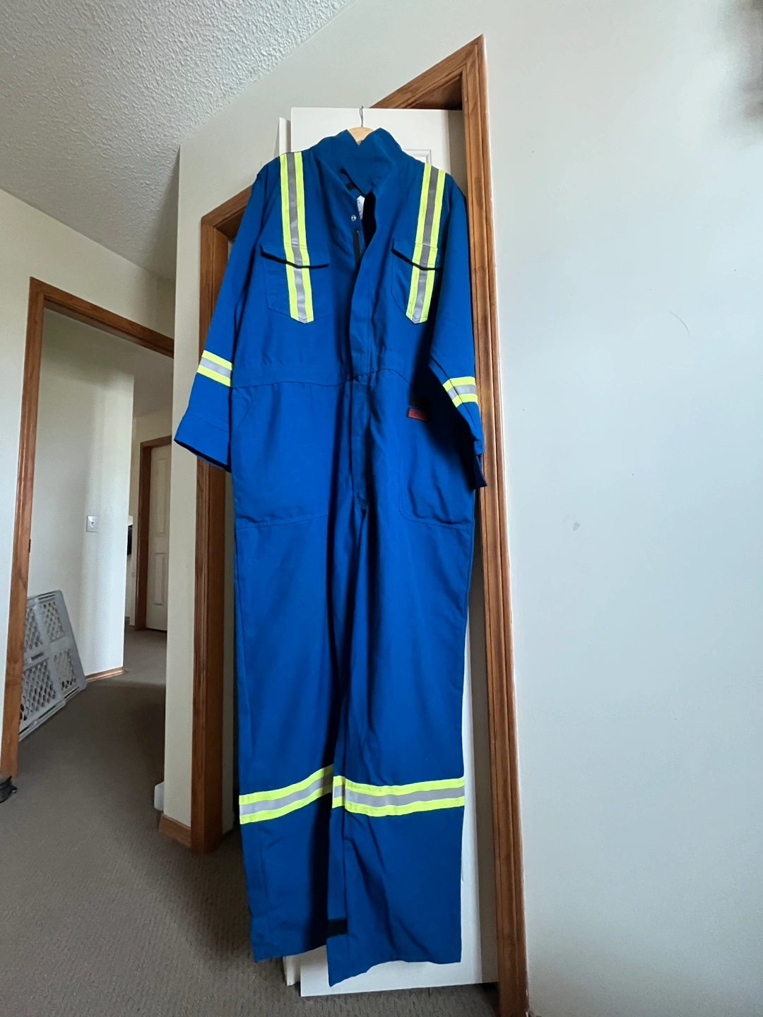 71Blue work coveralls. Features reflective tape. Long sleeves and full length.