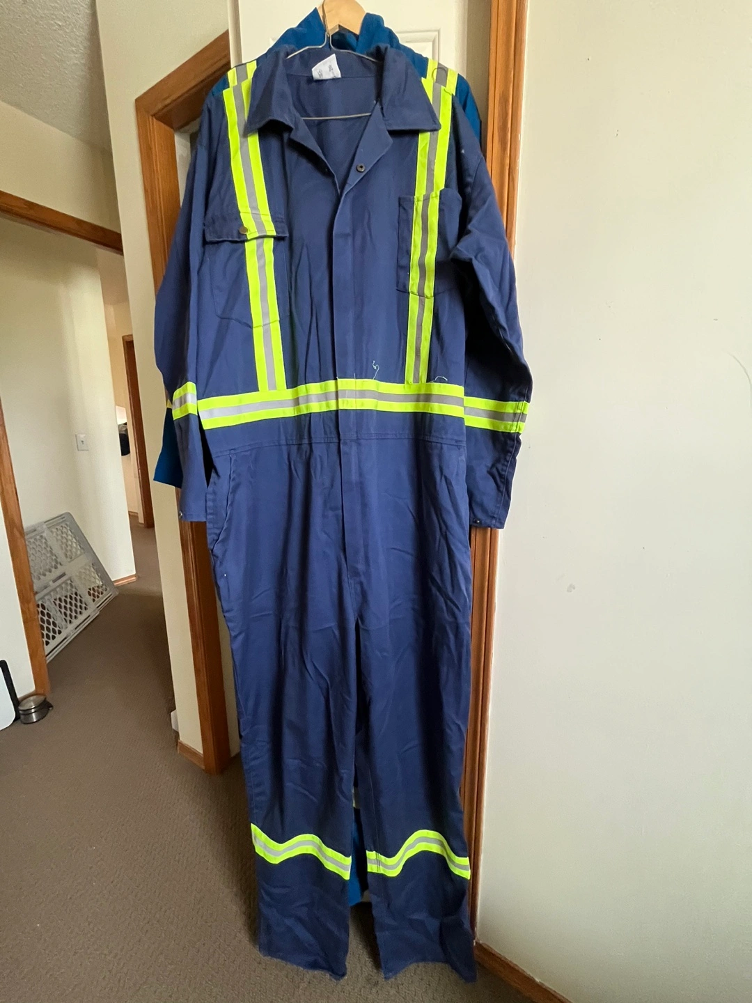 71Durable navy blue work coveralls. Features reflective tape for increased visibility. Multiple pockets. Good used condition.