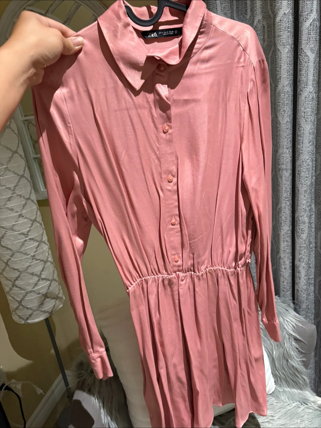 71Beautiful dusty rose mini dress. Long sleeves, collared neckline, button-up front. Elastic waist. Size S.