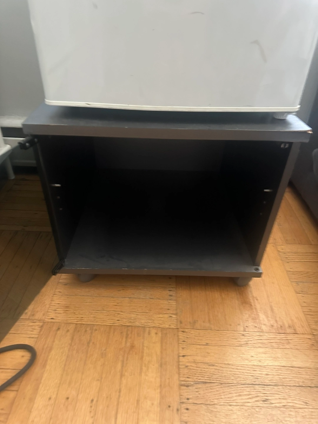 Small, dark grey wood cabinet. Features a glass door. Suitable for storing small appliances or other items. Some minor wear and tear.