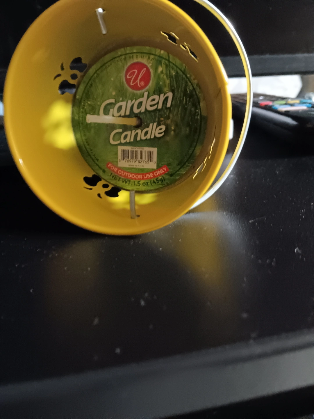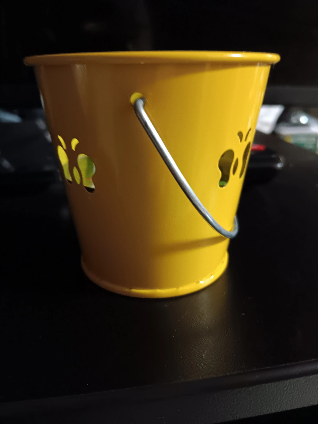 Small yellow metal bucket. Metal handle. Cutout designs. For outdoor use only. Never used. is ggod to avoid insects.