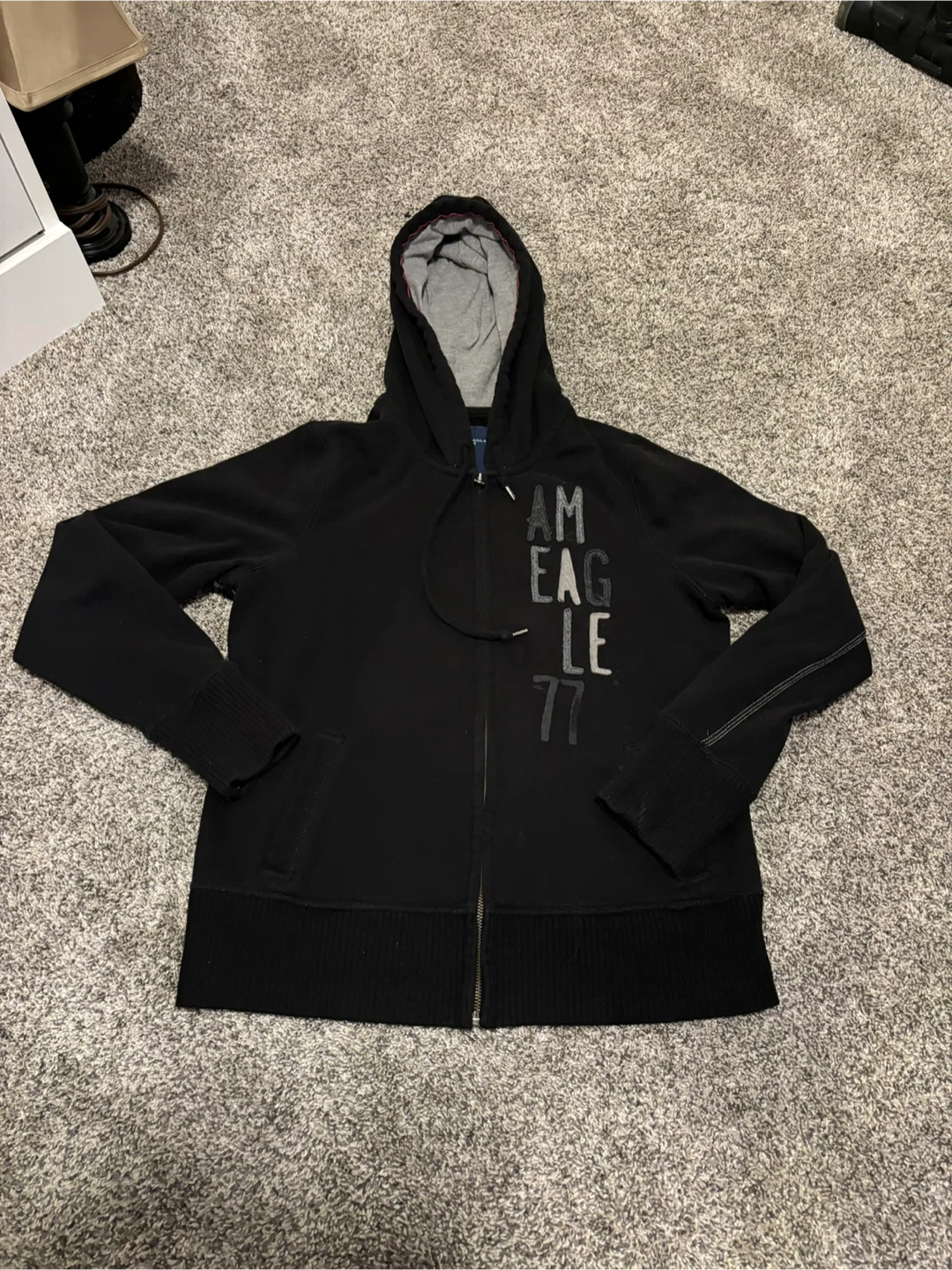 Selling an American Eagle Outfitters "Eagle Fleece" hoodie in size large! It's black with the brand name printed vertically on the front. Great for layering or wearing on its own!