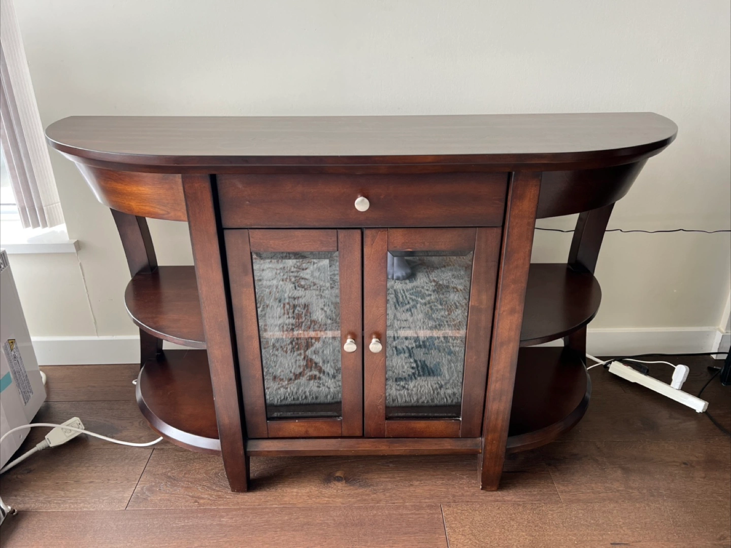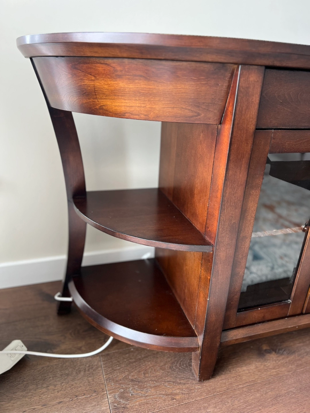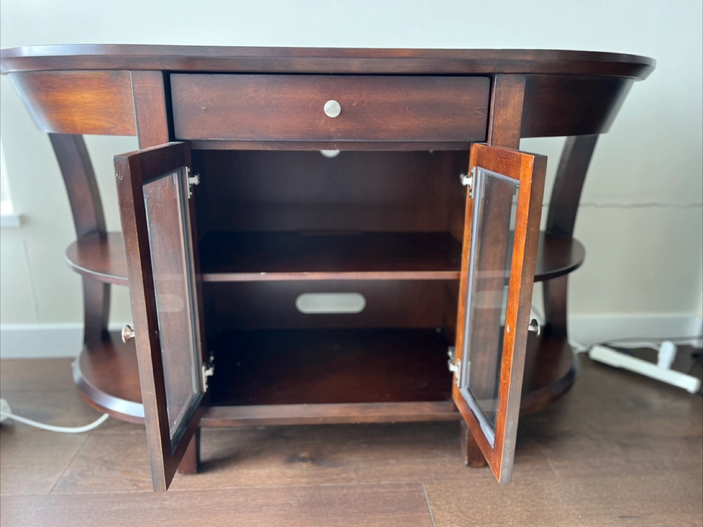 Curved console table. Features one drawer, two glass-paned doors, and two open shelves. Dark brown wood finish. Good for entryway or living room. Size: 52” W x 30” H x 16” D. Can even fit a TV on top. Feel free to send me an offer!