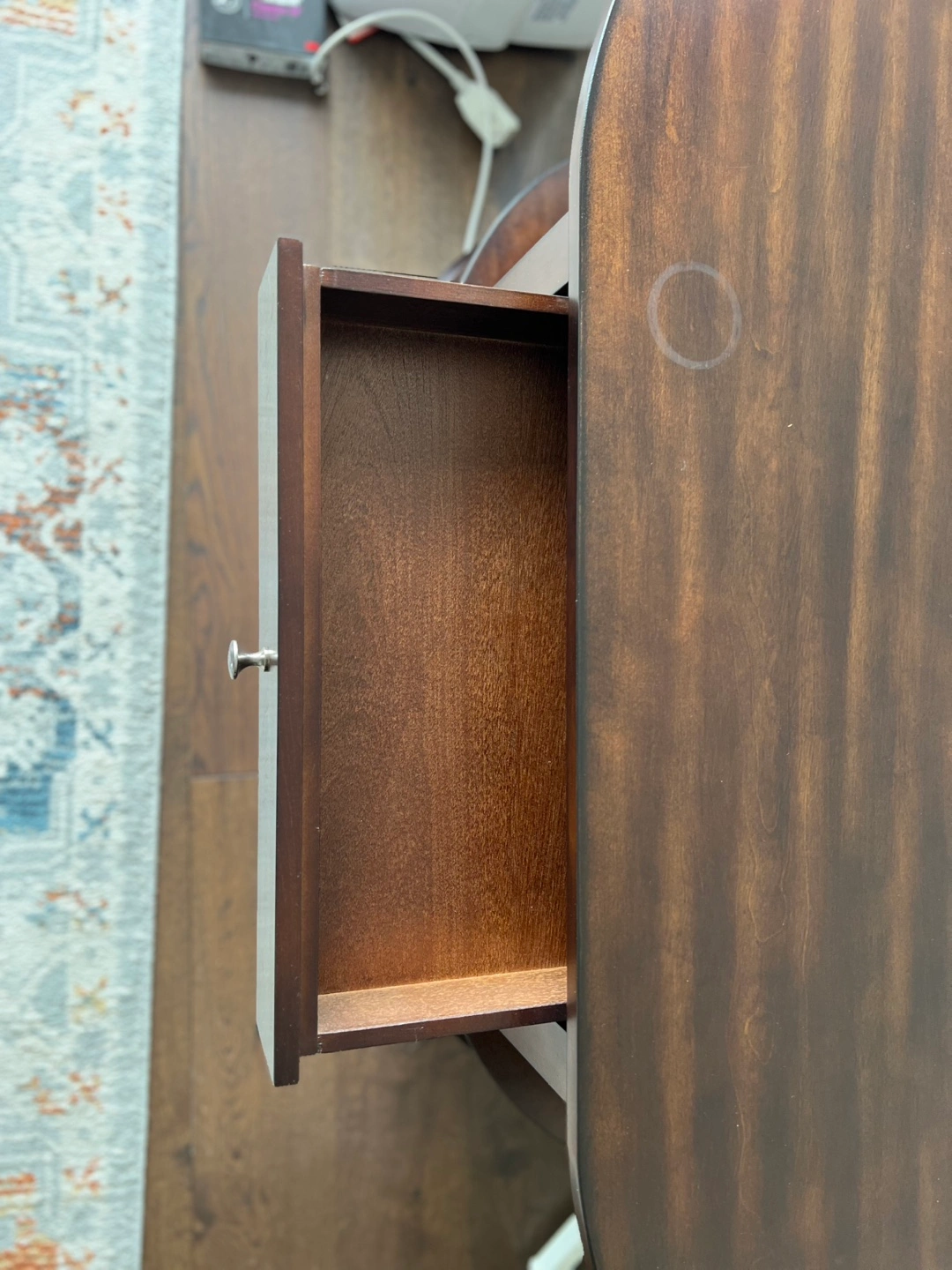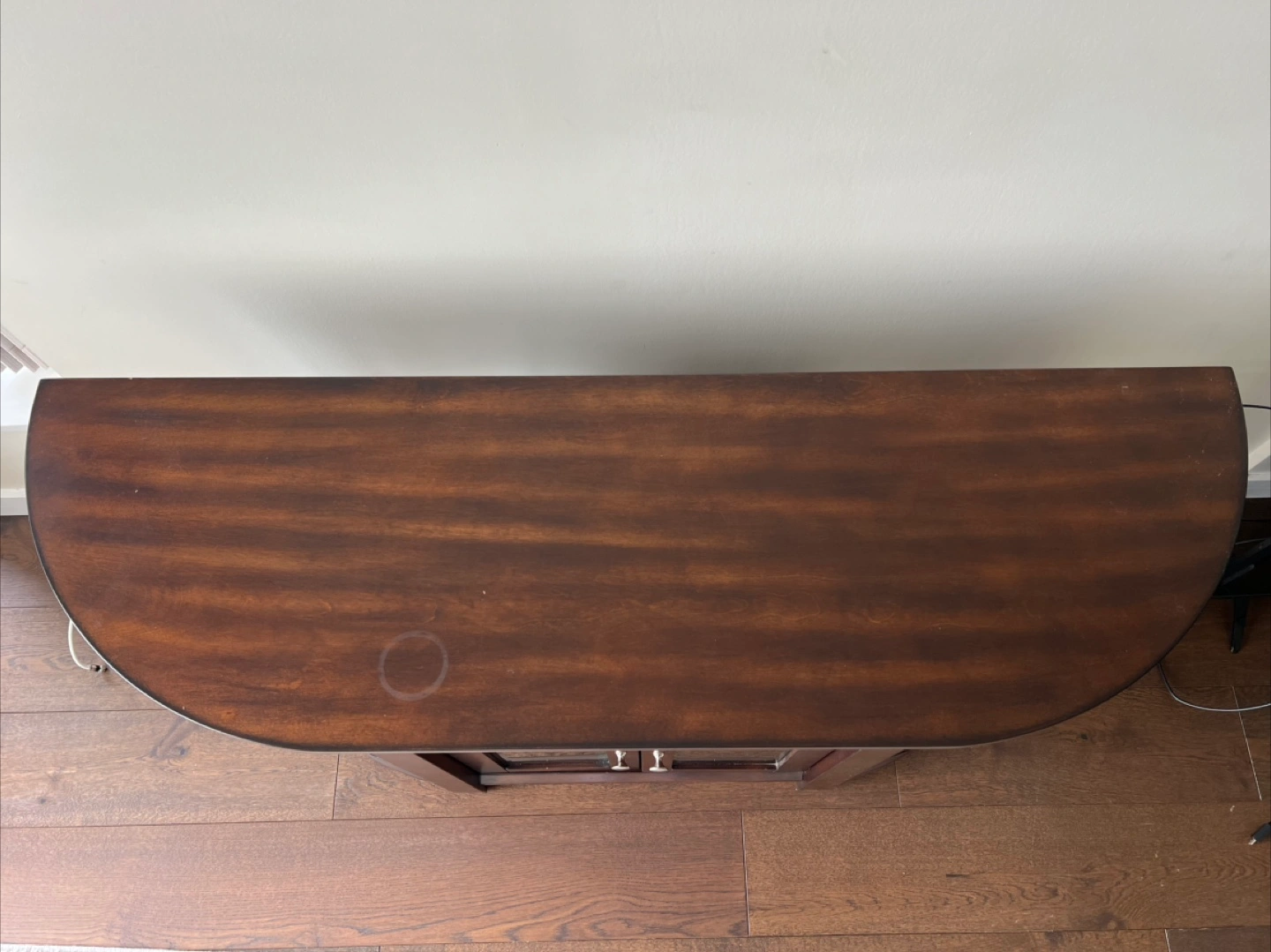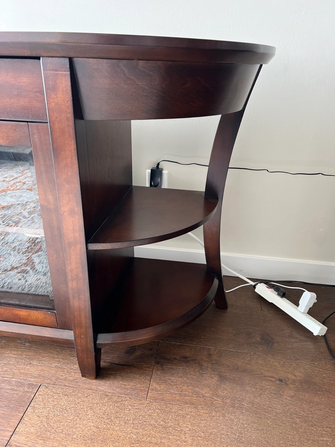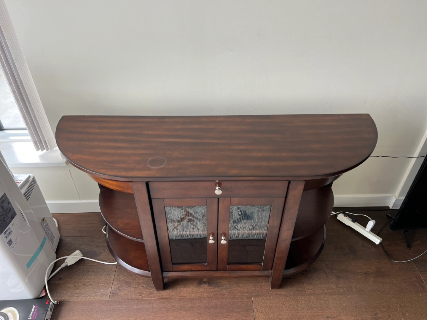 Curved console table. Features one drawer, two glass-paned doors, and two open shelves. Dark brown wood finish. Good for entryway or living room. Size: 52” W x 30” H x 16” D. Can even fit a TV on top. Feel free to send me an offer!