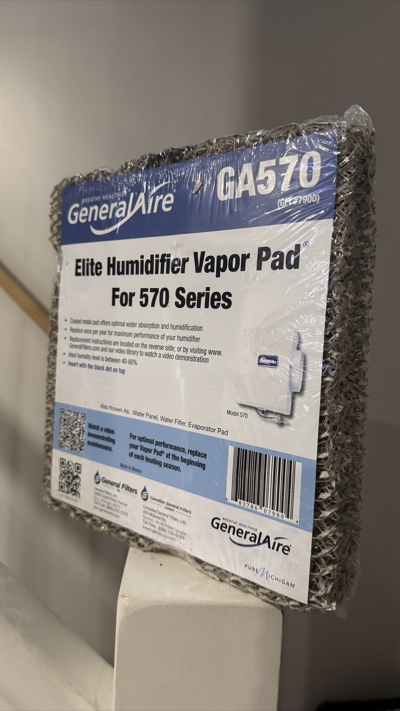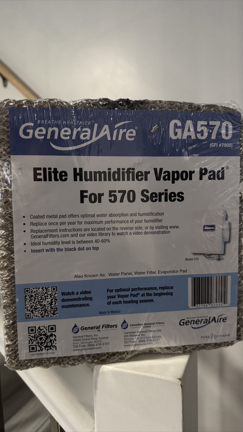 New in package. Humidifier vapor pad. Replace once per year for optimal performance. Fits 570 series humidifiers. Coated metal offers optimal water absorption and humidification.
