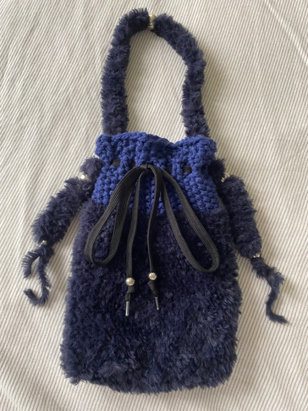 Adorable mini bag. Features fuzzy dark blue exterior and a dark blue knitted drawstring top. Silver coloured accents. Great for carrying small essentials.