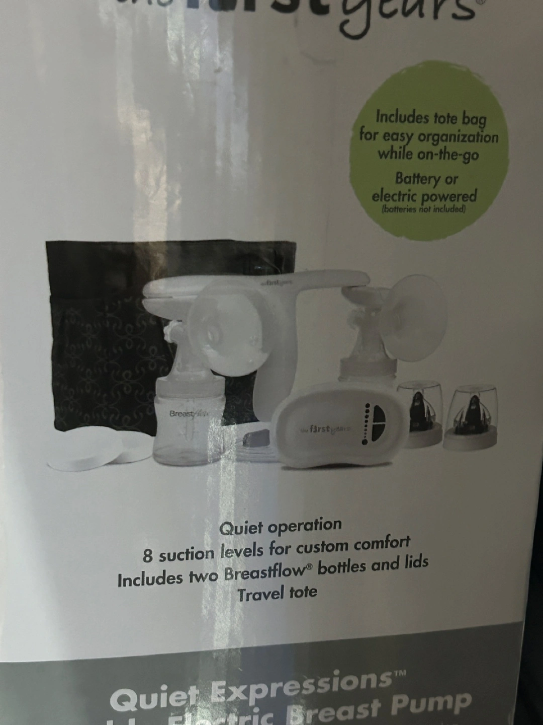 Quiet operation. Eight suction levels for custom comfort. Includes two Breastflow bottles and lids. Travel tote. Battery or electric powered. Tote bag for easy organization while on-the-go.